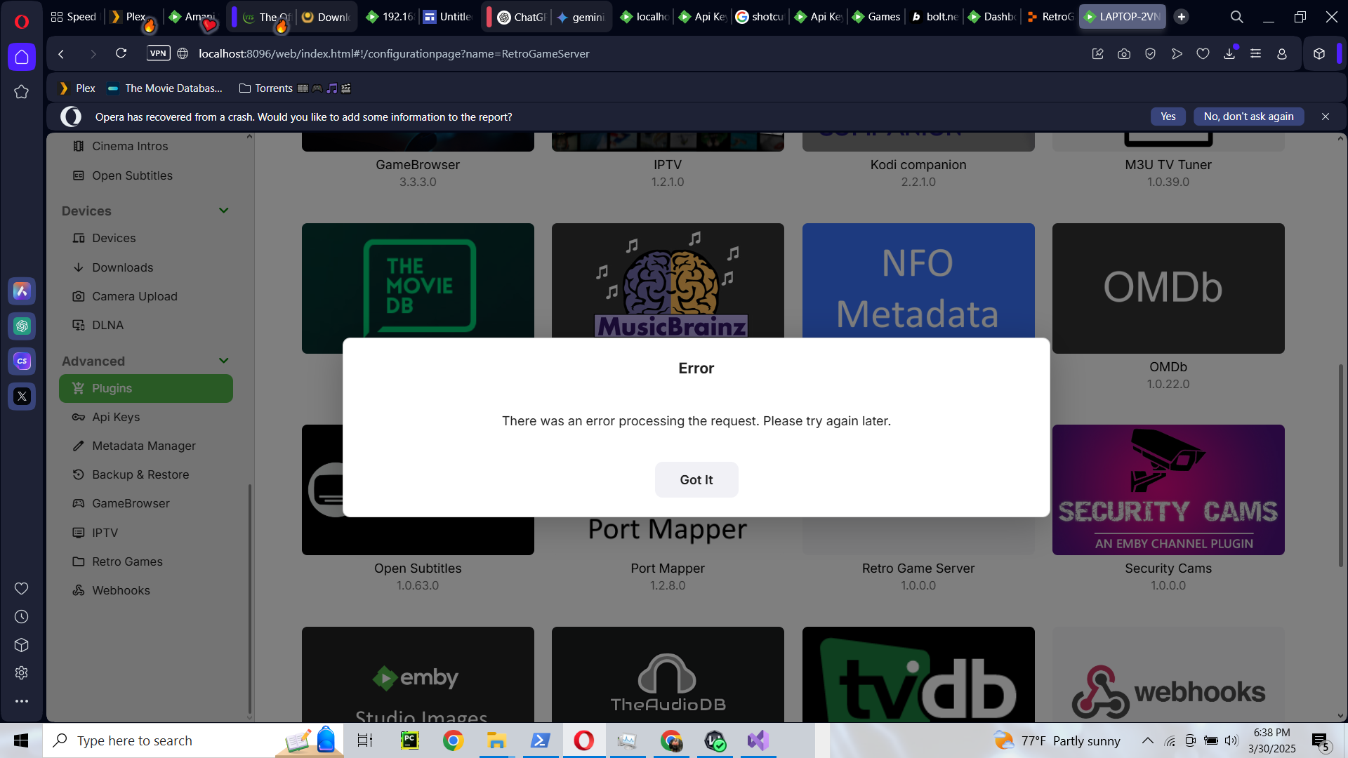 Syntax24 4 Posted April 8, 2025 Author Posted April 8, 2025 (edited) @LukeI am missing something when it comes to having Emby recognize an html file. For some reason I can get the plugin page to load as long as there isn't an html in the files, once I create an html I can never get my custom settings screen to load. Any Pro Tips. I am marking them as an embedded resource. I have also attached a copy of my Log Files. The Plugin is named "Amani RetroCloud". embyserver (16).txt Edited April 8, 2025 by Syntax24