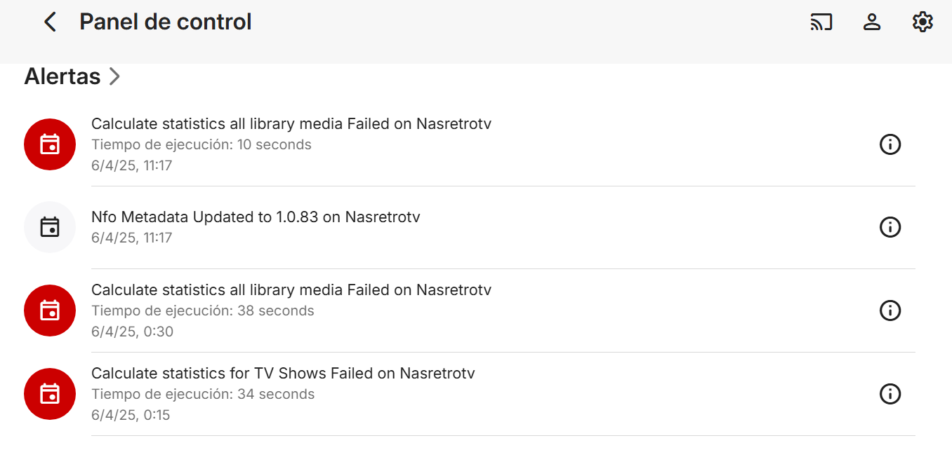 retroseriestv 0 Posted April 4, 2025 Posted April 4, 2025 Hola...todos los dias me salen estos dos errores mas a o menos a la misma hora..... Calculate statistics for TV Shows Failed on (mi servidor...) Calculate statistics all library media Failed on (mi servidor...) Todo parece funcionar bien, pero estos mensajes son molestos y lo peor de todo..me preocupan porque no se si es que tengo algo mal configurado...¿alguna ayuda, please? Gracias