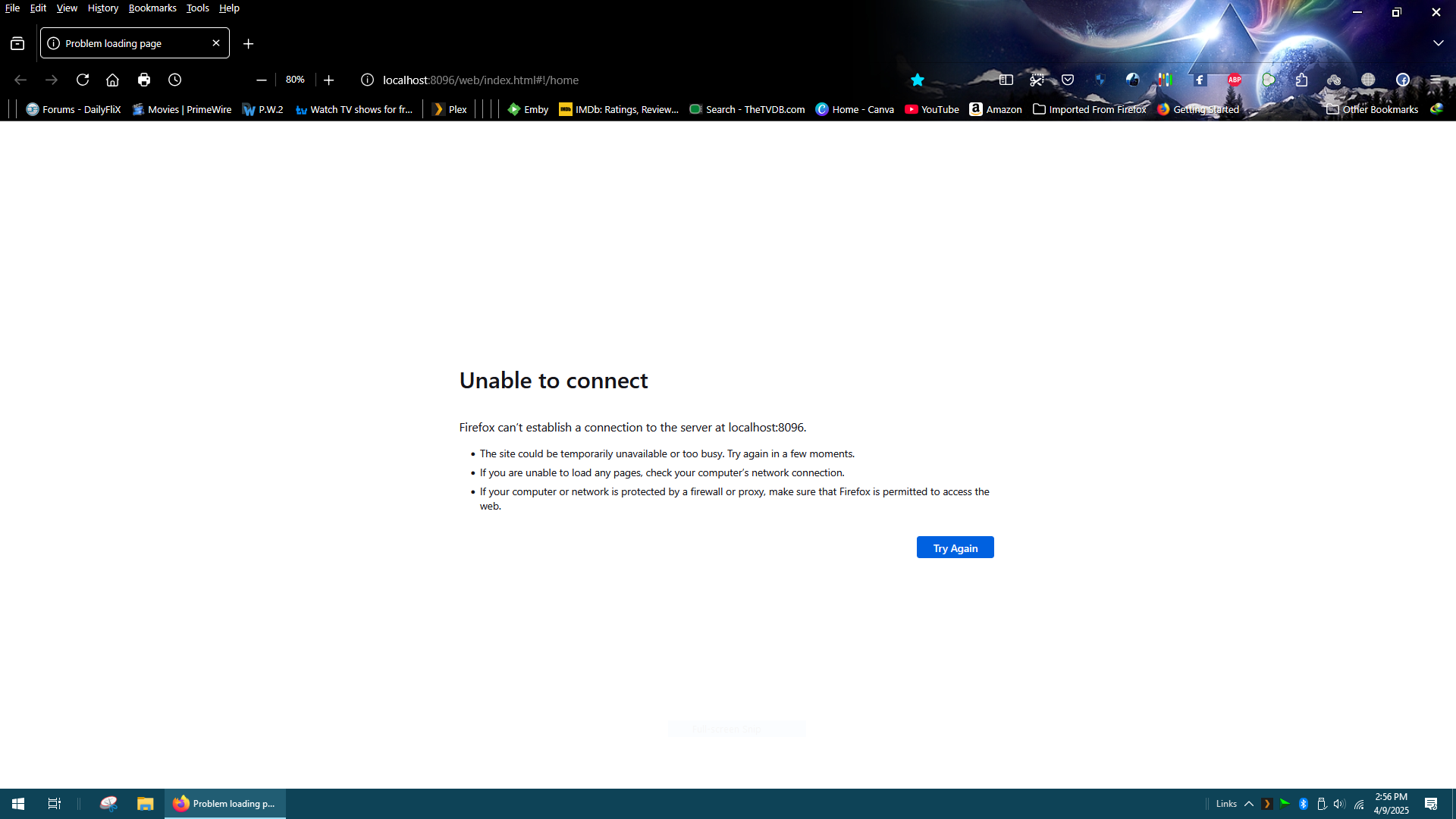 Trekdriver3 12 Posted April 9, 2025 Author Posted April 9, 2025 2 minutes ago, Trekdriver3 said: Trying to connect from inside my home. Nothing has changed since yesterday. The screen shot I sent was my t.v. I cannot connect on any device. P.C. (win 10) Locol host 8096, None of my televisions, nor on my android phone app. I have no idea if the server is running as I can't connect. Screenshot of my p.c.