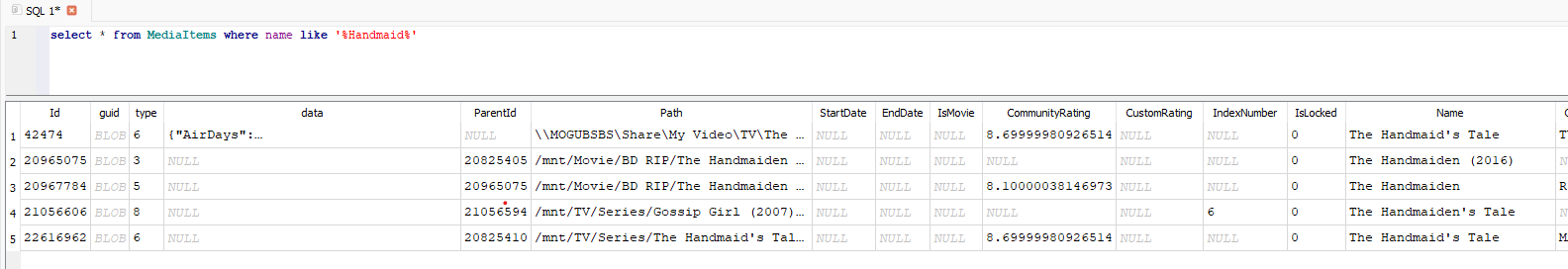 Mogub 1 Posted April 11, 2025 Author Posted April 11, 2025 12 minutes ago, Luke said: Does that library actually work with the library scan? I would think you'd see the same exception in the log when running a normal scan. Yes, the library scan is working and the auto organize is working for almost all series except for 2-3, last time I put the file directly in the folder to get it working but I would like to know why only 2-3 series in the library return me the old path instead of the new one even when the path in the metadata is fine: So, looking in the library.db return this : So, I stop Emby, copy the library.db, update all line in mediaitems with wrong path info in it with an update query, copy the library.db back and restart Emby and voilà!!!!! The auto organize is now working. Don't know why but Auto Organize and the metadata manager don't get information from the same ID in the library.db and it's look like old information remains there. Look like auto organize read the line ID 42474 and the metadata manager the 22616962. ID 42474 look like an old remaining of a database update, he don't have any parentID like the 22616962 where the parent tree look like this : In the library.db, searching for "select * from mediaitems where parentid is null and type = 6" return me 171 records. Got a copy of the library.db before making change in it if you need it...