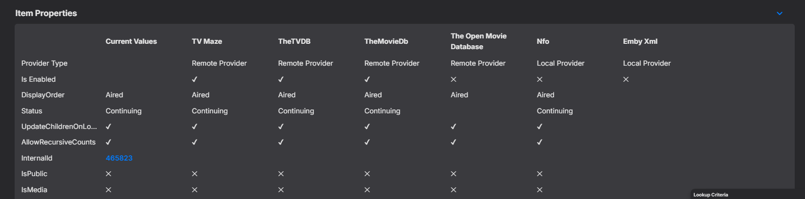 Happy2Play 9780 Posted April 22, 2025 Posted April 22, 2025 I would reorder your provider list so it rewrites itself as the only way to check it would be to pull the library config from the api. Spoiler { "Name": "TV shows - TVMAZE Testing", "Locations": [ "E:\\Media\\TVMAZE Testing" ], "CollectionType": "tvshows", "LibraryOptions": { "EnableArchiveMediaFiles": false, "EnablePhotos": true, "EnableRealtimeMonitor": true, "EnableMarkerDetection": false, "EnableMarkerDetectionDuringLibraryScan": false, "IntroDetectionFingerprintLength": 10, "EnableChapterImageExtraction": false, "ExtractChapterImagesDuringLibraryScan": false, "DownloadImagesInAdvance": true, "CacheImages": false, "PathInfos": [ { "Path": "E:\\Media\\TVMAZE Testing" } ], "IgnoreHiddenFiles": false, "IgnoreFileExtensions": [], "SaveLocalMetadata": true, "SaveMetadataHidden": false, "SaveLocalThumbnailSets": false, "ImportPlaylists": true, "EnableAutomaticSeriesGrouping": false, "ShareEmbeddedMusicAlbumImages": true, "EnableEmbeddedTitles": false, "EnableAudioResume": false, "AutoGenerateChapters": true, "AutomaticRefreshIntervalDays": 0, "PlaceholderMetadataRefreshIntervalDays": 0, "PreferredMetadataLanguage": "", "PreferredImageLanguage": "", "ContentType": "tvshows", "MetadataCountryCode": "", "MetadataSavers": [], "DisabledLocalMetadataReaders": [], "DisabledLyricsFetchers": [], "SaveLyricsWithMedia": true, "LyricsDownloadMaxAgeDays": 180, "LyricsFetcherOrder": [], "LyricsDownloadLanguages": [], "DisabledSubtitleFetchers": [], "SubtitleFetcherOrder": [], "SkipSubtitlesIfEmbeddedSubtitlesPresent": false, "SkipSubtitlesIfAudioTrackMatches": false, "SubtitleDownloadLanguages": [], "SubtitleDownloadMaxAgeDays": 180, "RequirePerfectSubtitleMatch": true, "SaveSubtitlesWithMedia": true, "ForcedSubtitlesOnly": true, "HearingImpairedSubtitlesOnly": false, "TypeOptions": [ { "Type": "Series", "MetadataFetchers": [ "TheTVDB", "TheMovieDb", "TV Maze" ], "MetadataFetcherOrder": [ "TV Maze", "TheTVDB", "TheMovieDb", "The Open Movie Database" ], "ImageFetchers": [ "TheTVDB", "FanArt", "TV Maze", "TheMovieDb" ], "ImageFetcherOrder": [ "TV Maze", "TheTVDB", "FanArt", "TheMovieDb", "The Open Movie Database" ], "ImageOptions": [] }, { "Type": "Season", "MetadataFetchers": [ "TheTVDB", "TV Maze", "TheMovieDb" ], "MetadataFetcherOrder": [ "TV Maze", "TheTVDB", "TheMovieDb" ], "ImageFetchers": [ "TheTVDB", "TV Maze", "FanArt", "TheMovieDb" ], "ImageFetcherOrder": [ "TV Maze", "TheTVDB", "FanArt", "TheMovieDb" ], "ImageOptions": [] }, { "Type": "Episode", "MetadataFetchers": [ "TheTVDB", "TV Maze", "TheMovieDb" ], "MetadataFetcherOrder": [ "TV Maze", "TheTVDB", "TheMovieDb", "The Open Movie Database" ], "ImageFetchers": [ "TheTVDB", "Image Capture", "TV Maze", "TheMovieDb" ], "ImageFetcherOrder": [ "TV Maze", "TheTVDB", "TheMovieDb", "The Open Movie Database", "Image Capture" ], "ImageOptions": [] }, { "Type": "Movie", "MetadataFetchers": [ "TheMovieDb", "TheTVDB" ], "MetadataFetcherOrder": [], "ImageFetchers": [ "TheMovieDb", "TheTVDB", "FanArt", "Image Capture" ], "ImageFetcherOrder": [], "ImageOptions": [] } ], "CollapseSingleItemFolders": false, "EnableAdultMetadata": false, "ImportCollections": false, "MinCollectionItems": 2, "MinResumePct": 3, "MaxResumePct": 90, "MinResumeDurationSeconds": 120, "ThumbnailImagesIntervalSeconds": 10, "SampleIgnoreSize": 314572800 }, "ItemId": "18045", "Id": "18045", "Guid": "f79ebc39dd3b4781b7360c662b638be6" }