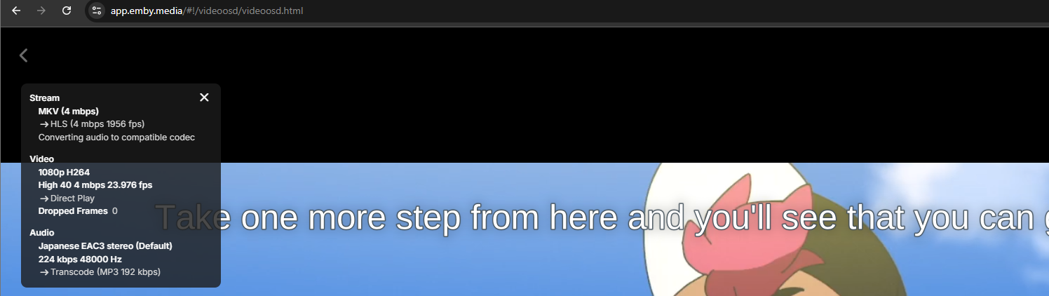drapacioli 8 Posted April 20, 2025 Posted April 20, 2025 (edited) Hi, don't know where to start with this but long story short I tried updating my emby server instance tonight because I was getting oversized subtitles on some videos with formatted subs on the web player (.SSA/.ASS format, subs were larger than they were supposed to be according to the person responsible for formatting them, and were cutting off the screen). I had to update several times because I guess it had a lot to update since last time I did this, but after it was done, instead of fixing the subtitles, they disappeared completely during playback. Apparently, the only way to get them to show properly is to force transcoding by disabling subtitle extraction on the fly, but I'm trying to avoid using transcoding due to the fact this is running on a server with a few other time-sensitive processes that need the CPU to be available. But it gets weirder. If I access the server via the app.emby.media domain instead of directly via IP or through my own DDNS domain, the subtitles *do* work, and they're the correct size, but some of the formatting is dropped. So now I have three different ways I access the same file, and get three different results... What's going on here? Did I break something on my local instance by trying to update the server? If I check the console while trying to play back a video with these formatted subtitles, I see a few errors related to subtitles: Playback on app.emby.media domain - subtitles are missing formatting for the record: Same video file on direct IP (address bar not included for privacy), subtitles are missing, same encoding stats: Direct IP with subtitle extraction disabled, note formatting is different as well for some reason - probably correctly formatting it as part of the transcoding process?: I did try on my Apple TV as well, it seems to be fine which to me seems to suggest it's a problem specifically with the web player: Edited April 20, 2025 by drapacioli Added screenshots