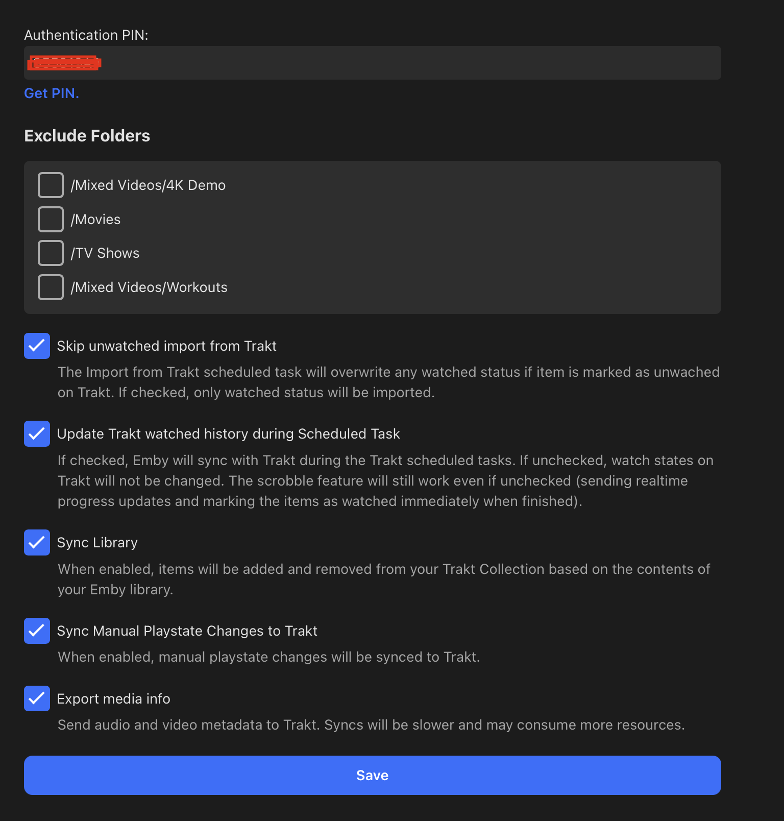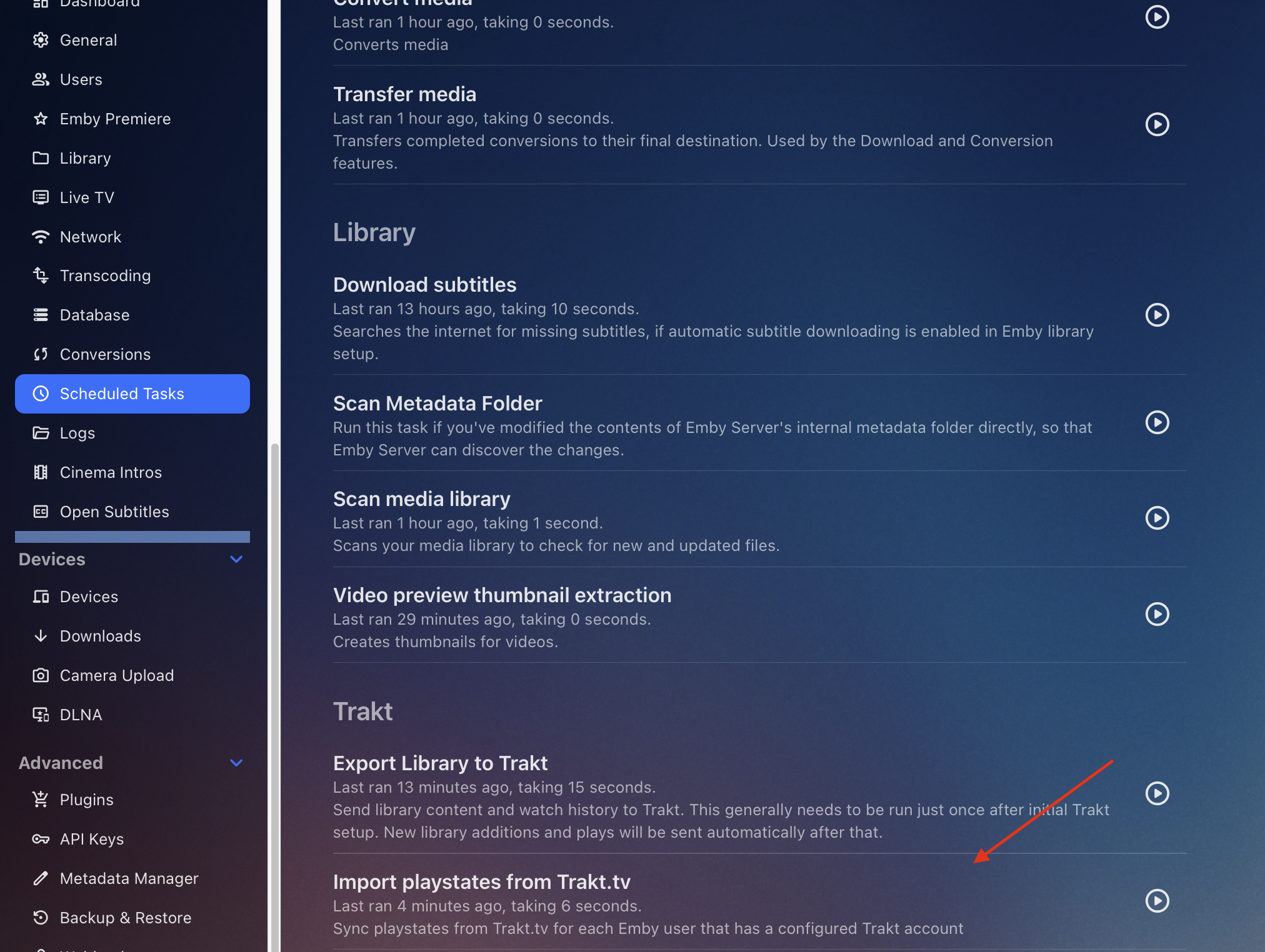 Solution Blue278 22 Posted May 3, 2025 Author Solution Posted May 3, 2025 (edited) On 20/04/2025 at 07:55, Blue278 said: I have been having this issue for about 3 months. Any help would be greatly appreciated. I have an Emby Premiere account. Syncing now. scheduled Task > Trakt > Import playstates from Trakt.tv. Very odd place to put it. I would have thought it would be combined with Trakt options. Found "Import playstates from Trakt.tv" purely by accident. Edited May 3, 2025 by Blue278 1