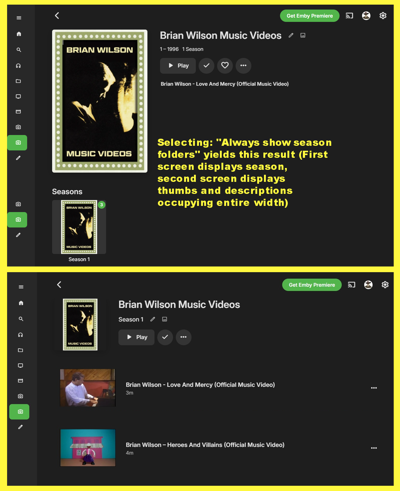 Daniel1966 6 Posted April 28, 2025 Posted April 28, 2025 Regarding Music Videos Library, there are three Display options. "Show all episodes of all season together" "Show all episoides for only single season shows" "Always show season folders" Referencing the screenshots below, the way the episodes display is affected by which choice you make. . I would like to the best of both : Skip the screen having to choose the season first, but still retain the ability to display the epiodes across the full with of the screen instead of as Thumbs. . I cannot figure out how to achieve this. . I am running the latest version. . ALSO: I am using the Library Type "Music Videos" so why is there a "Season" at all? . Thanks for any help. .