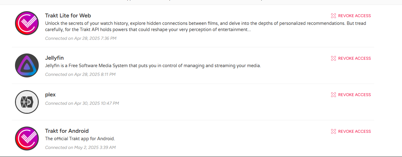 Airbender 128 Posted May 5, 2025 Author Posted May 5, 2025 Hi here is different example i went a head and connected JellyFin to trakt just to see if there is a differences in how connections works Working Behavior in Jellyfin (and Plex) In Jellyfin, the Trakt connection process is smooth: I select the user I want to connect to Trakt. Jellyfin initiates the Trakt authentication and opens a page asking for a PIN. The PIN is displayed inside Jellyfin, not on the Trakt site. I enter that PIN into the Trakt authorization page. Once submitted, I get a success message like this: "Woohoo! Your device is now connected" attached After that, Jellyfin shows up under my Trakt connected apps: Trakt Connected Apps Screenshot for JellyFin NOT EMBY I hope this help