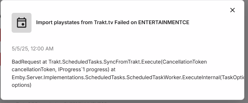 Airbender 128 Posted May 5, 2025 Author Posted May 5, 2025 Hi Luke, Issue Summary: Trakt plugin (v3.8.0.0) fails to sync with Trakt.tv after PIN authorization. Error appears to occur during token exchange, resulting in repeated BadRequest responses. PIN was generated and activated on Trakt.tv successfully, but authentication does not complete in Emby. 2025-05-04 00:00:00.014 Info Trakt: Syncing user data for Soma 2025-05-04 00:00:01.143 Info HttpClient: POST https://api.trakt.tv/oauth/token 2025-05-04 00:00:01.310 Error Trakt: Error in SyncUserData MediaBrowser.Model.Net.HttpException: BadRequest at Trakt.Api.TraktApi.PostToTrakt(String url, Object data, TraktUser traktUser, CancellationToken cancellationToken) at Trakt.Api.TraktApi.RefreshUserAuth(TraktUser traktUser, CancellationToken cancellationToken) 2025-05-04 20:08:57.059 Info BaseItem: Updating trakt user, reset pin info: True 2025-05-04 00:00:02.503 Error Trakt: Error syncing trakt data for user Soma MediaBrowser.Model.Net.HttpException: BadRequest at Trakt.Api.TraktApi.PostToTrakt(String url, Object data, TraktUser traktUser, CancellationToken cancellationToken) at Trakt.Api.TraktApi.RefreshUserAuth(TraktUser traktUser, CancellationToken cancellationToken) Still receiving BadRequest during oauth/token POST.