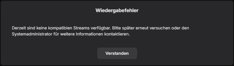 LukasH97 0 Posted May 5, 2025 Author Posted May 5, 2025 Thank you very much – that solved the problem! However, I’m now encountering a new error message. The stream plays without any issues when opened in VLC media player. Message: Playback Error No compatible streams are currently available. Please try again later or contact your system administrator for more information.