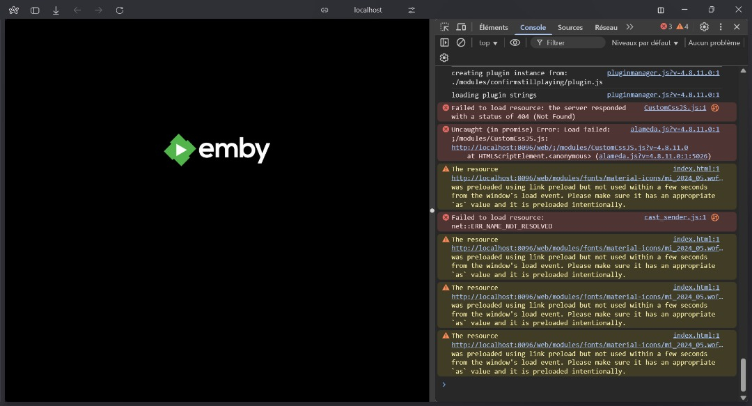 DodoVIII 0 Posted May 4, 2025 Posted May 4, 2025 Hi everyone, I’m having trouble starting Emby Server on Windows. It gets stuck on the splash screen and doesn’t load the web interface at all. After checking the browser console (localhost:8096), I’m getting a 404 error related to CustomCssJS.js: I suspect this is related to the Custom CSS/JS plugin, which I had previously installed. Now, Emby won’t even start when I run embyserver.exe. I’ve already tried: -Deleting browser cache -Disabling antivirus -Renaming the plugins folder to plugins_backup -Deleting the cache and logs folders Still no luck – Emby doesn’t launch at all anymore. Any help would be appreciated to: Completely remove the broken plugin Recover the server without losing my library and settings Thanks in advance!