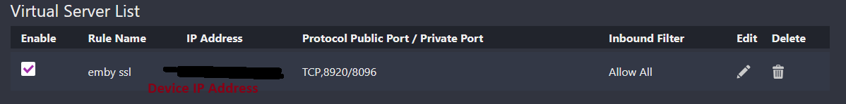 Q-Droid 989 Posted May 6, 2025 Posted May 6, 2025 (edited) Start simple then move to the next step after each is working. That Virtual Server List image doesn't look quite right. For a basic setup the public and private ports should match: 8096 public -> 8096 private, same for 8920 -> 8920. 1. Check with canyouseeme.org. Does the detected IP address on the site match your router WAN IP? - If not then check with your ISP to see if they're using CGNAT. - If they don't use CGNAT make sure you don't have double-NAT. Like your own router behind the ISP router. 2. If the WAN IP is good then forward port 8096 WAN/public to 8096 LAN/private server IP. - Check connection from a browser to emby using http://WAN IP:8096. - Some routers don't allow NAT loopback/hairpinning. You can always try a mobile browser not connected to the LAN or WiFi. - If it doesn't work keep at it until you can get it working. 3. Get DNS setup to resolve to your WAN IP, not LAN. - Check connection again from a browser to emby using http://DNS name:8096. - If DNS doesn't work but IP does then get the name to IP resolution working before moving on. - Setting up URL redirects from the DNS provider can cause problems with Emby apps. Probably should avoid if you can. 4. Check connection from browser to emby using https://LAN IP:8920. - It should connect but throw a site/certificate error - Not Secure. You can click through to connect. - If it doesn't connect then check your certificate file to make sure it and the password are correct and emby can access the file. - Keep at it until you can get it working. 5. Forward router port 8920 WAN/public to 8920 LAN/private server IP. - Check connection from a browser to emby using https://DNS name:8920. - Some routers don't allow NAT loopback/hairpinning. You can always try a mobile browser not connected to the LAN or WiFi. - Keep at it until you can get it working. 6. Check the emby dashboard and make sure the access (LAN/WAN) details are correct. - Adjust as needed. 7. Close/remove the 8096 port forwarding on your router, you don't need it for WAN access. 8. If it's working now then scrap all of it and setup a reverse proxy. Just kidding...but not really. Consider that your next project. Caddy is popular and easy to setup with Emby. Edited May 6, 2025 by Q-Droid 1