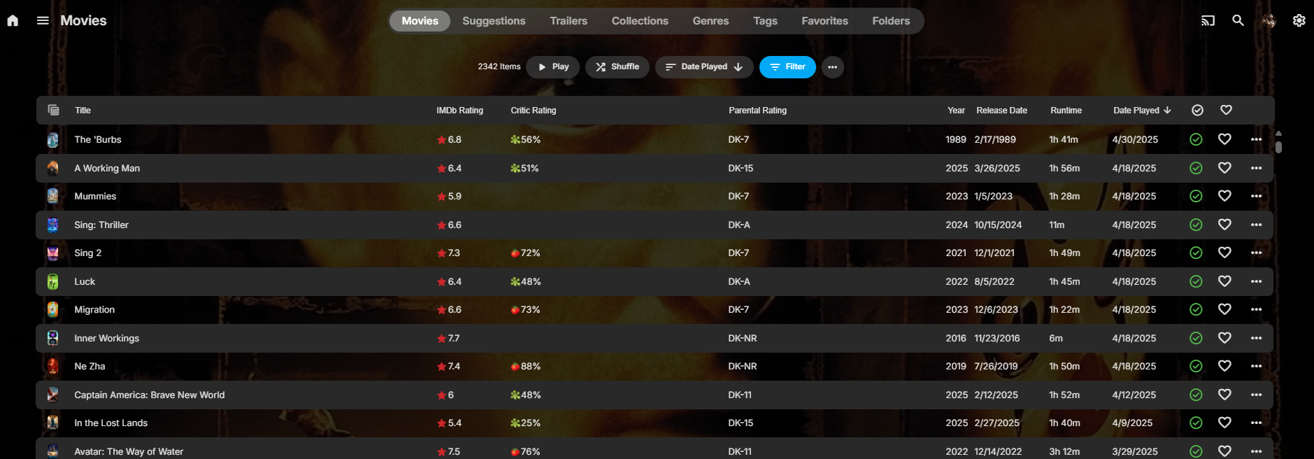 jedischultz 3 Posted May 6, 2025 Posted May 6, 2025 Correct me if I am wrong, only on Emby for the last 4 days. I'm a movie junkie. Under the "Last Played" option of the Library organization listing, the current list displays the last movie (in this case) that I played, however, my request is to add a 3rd line (under the name of the movie, the year it came out and rating), to include a time stamp of the date it was watched. I actually have used this in the past to make sure that I do not re-watch a movie until it has been a year for myself. Thank you.