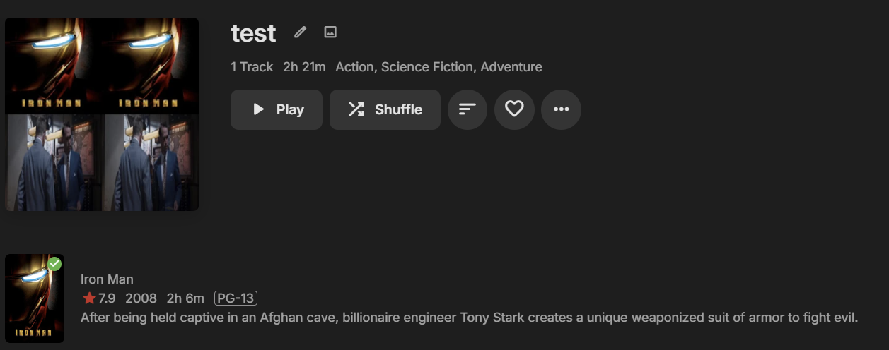 fraenhawk 61 Posted May 9, 2025 Posted May 9, 2025 Running 4.8.11.0 I was working on updating my playlist and thought something was missing so I went to re-add it (even though I was sure it was always there) and it gave me the "this already is in the playlist, add again or skip" option, so the item was detected in the playlist but not showing. Confused, I also checked the m3u file and found it (both the original and when I added again at the bottom) even though neither copy shows in the web interface. So I created a new playlist with only 2 items to test. When I added the movie extra as item 2, the auto-generated icon changed from 4 copies of the same cover to 2 and 2, so it saw the item and read its picture, yet in the web interface it says 1 track and only shows 1 item?! I can mix movies and tv together no problem but movie extras seem to all disappear. #EXTM3U #PLAYLIST:test #EXTINF:7560,Iron Man file:\\whshawk\mcu movies\Iron Man (2008)\Iron.Man.2008.PROPER.REMASTERED.1080p.BluRay.x265-RARBG.mp4 #EXTINF:929,Marvel One-shot - Agent Carter (2013) file:\\whshawk\mcu movies\Iron Man 3 (2013)\Extras\Marvel One-shot - Agent Carter (2013).mp4