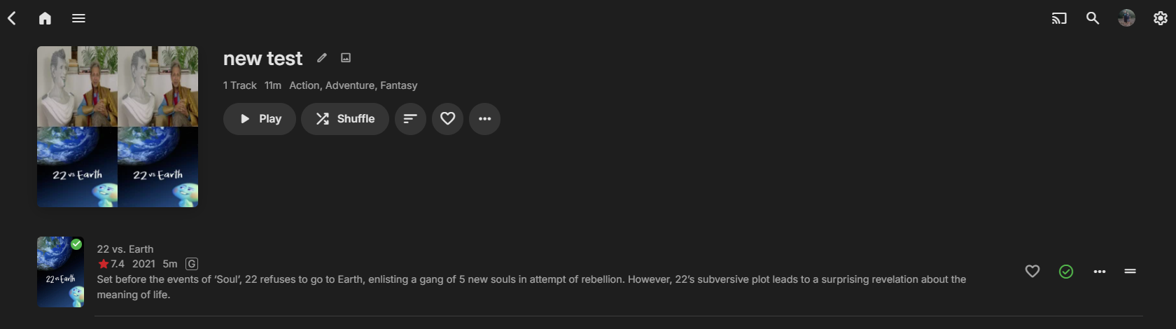 fraenhawk 61 Posted October 6, 2025 Author Posted October 6, 2025 Just to make sure there's no caching or problem with leftover files not being cleaned up, I went with completely different files and a new playlist name and still seeing the problem. I don't even have to test as far to see the problem. This time I did it backwards, I found an Extra in a movie (\\whshawk\mcu movies\Thor, Ragnarok (2017)\Extras\Team Darryl.mp4) and clicked add to playlist and created a new playlist called "new test." Then went to my Playlists and see the new playlist added and it's using the same thumbnail the extra shows on the movie screen (x4) and has NO contents to the playlist that can be played. If I then add a movie to the playlist, I get thumbnails updated 2x2 but only one item in the list: At first I thought maybe the issue was length of video, but I just so happened to pick a "movie" (short) that was under 6 minutes and it showed in the playlist vs the extra that is over 6 minutes and doesn't. I don't see anything odd in the logs at time of creation: 2025-10-06 09:41:56.503 Info PlaylistService-0HNG230N7KE75:00000035: http/1.1 POST http://host9:8096/emby/Playlists?Name=new test&Ids=150445&userId=f6c51e6fd330e59d16f4cc52886702e1&X-Emby-Client=Emby Web&X-Emby-Device-Name=Chrome Windows&X-Emby-Device-Id=ffb3e744-0191-4cae-94ec-bbde65e37ee2&X-Emby-Client-Version=4.9.1.80&X-Emby-Token=x_secret7_x&X-Emby-Language=en-us. Source Ip: host10, UserAgent: Mozilla/5.0 (Windows NT 10.0; Win64; x64) AppleWebKit/537.36 (KHTML, like Gecko) Chrome/140.0.0.0 Safari/537.36 2025-10-06 09:41:56.534 Info App: Saving playlist file C:\Users\Administrator\AppData\Roaming\MediaBrowser-Server\data\userplaylists\new test [playlist]\new test.m3u 2025-10-06 09:41:56.534 Info PlaylistManager: Playlist new test is initially created with 1 items 2025-10-06 09:41:56.534 Info PlaylistManager: Adding 1 items to playlist new test. skipDuplicates: False 2025-10-06 09:41:56.534 Info App: Added 1 items to playlist new test. skipDuplicates: False 2025-10-06 09:41:56.534 Info App: Saving playlist file C:\Users\Administrator\AppData\Roaming\MediaBrowser-Server\data\userplaylists\new test [playlist]\new test.m3u 2025-10-06 09:41:56.552 Info PlaylistService-0HNG230N7KE75:00000035: http/1.1 Response 200 to host10. Time: 50ms. POST http://host9:8096/emby/Playlists?Name=new test&Ids=150445&userId=f6c51e6fd330e59d16f4cc52886702e1&X-Emby-Client=Emby Web&X-Emby-Device-Name=Chrome Windows&X-Emby-Device-Id=ffb3e744-0191-4cae-94ec-bbde65e37ee2&X-Emby-Client-Version=4.9.1.80&X-Emby-Token=x_secret7_x&X-Emby-Language=en-us.