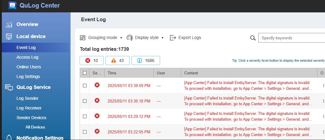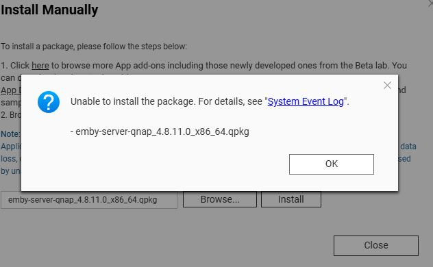 mcdonaldjr1 0 Posted May 12, 2025 Posted May 12, 2025 I downloaded "emby-server-qnap_4.8.11.0_x86_64 (1).qnap" install from ://emby.media/qnap-server.html. When i try to run the manual install on QNAP I receive an error "unable to install the package. The error log shows the message below: Error 2025-05-11 19:24:14 --- --- Web Desktop Mozilla/5.0 (Windows NT 10.0; Win64; x64) AppleWebKit/537.36 (KHTML, like Gecko) Chrome/136.0.0.0 Safari/537.36 App Center App Installation [App Center] Failed to install EmbyServer. The digital signature is invalid. To proceed with installation, go to App Center > Settings > General, and then select "Allow installation of applications without a valid digital signature". Is there another EMBY package for QNAP I can download from another site? If not, how do I resolve this issue?