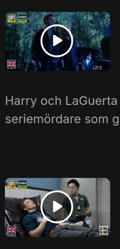 MediaIntelNUC 12 Posted June 29, 2025 Posted June 29, 2025 18 minutes ago, yocker said: Okay will look at it then. Until then, in case it might be this: For icons on TV show posters every single episode must have for example that same subtitle language. "Lite mode" changes that to only the first episode in a TV show to save on resources. Hi! I know, i have checked two examples in Dexter: Original Sin where ep.8 does not display swedish flag for subtitle but ep.9 does, pic attached. Both srt:s has the same languagecode, sv.srt wich is the same as all my attached srt:s. FYI i have not used "TV-lite" when scanning but regular scanning Both have same filename as mp4 file. Thanx! Dexter.Original.Sin.S01E09.Blood.Drive.1080p.WEBRip.x265-DH.sv.srt Dexter.Original.Sin.S01E08.Business.and.Pleasure.1080p.WEBRip.x265-DH.sv.srt