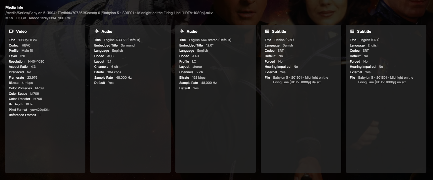Neminem 1518 Posted May 18, 2025 Posted May 18, 2025 (edited) 4 hours ago, keitaro26 said: Is there any way to apply the icon to the series posters on TV shows instead of the episodes themselves? I would think this would be problematic. Since the tv show poster does not contain audio or subs it self. But episodes does. If you have 5 episodes with audio eng + fra, subs eng + fra. And then another 5 episodes with audio fra, subs eng. What would be showen on the TV show poster, when having to choose between that. Edited May 18, 2025 by Neminem