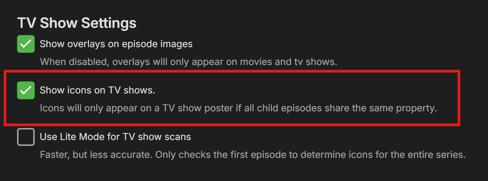 yocker 1247 Posted August 11, 2025 Author Posted August 11, 2025 (edited) New beta, please test every single little setting to the point that it's silly as i fixed the overlays not getting added or removed when enabling or disabling some settings without having to do a scan or metadata refresh. Added: 1. Aspect ratio snap, this will calculate weird aspect ratios to the nearest common known aspect ratio within a certain radius. This is to avoid having to have an icon for every single strange aspect ratio out there. 2. Aspect ratio calculator in the troubleshooter to see what aspect ratios will be shown and icon needed for any aspect ratio. 3. Option to disable series specials from the TV show aggregation calculation so that TV show specials will not be counted towards what icons will be shown. Changes: 1. Changed the caching system slightly to be more robust. This is not something anyone should notice. Fixed: 1. Overlays should now correctly get added or removed without a need to do a scan or metadata refresh, this might still be needed in some edge cases outside my control. 2. Overlays getting stale on episode posters in season view. Again please, PLEASE, test this to the point where it begs for mercy! I want this one to be as close to perfect as possible and it's hard to test everything my self without getting cross eyed. --- WARNING! WARNING! WARNING! --- This is a beta so please use in a test environment! EmbyIcons.dll Edited August 11, 2025 by yocker 1 1
