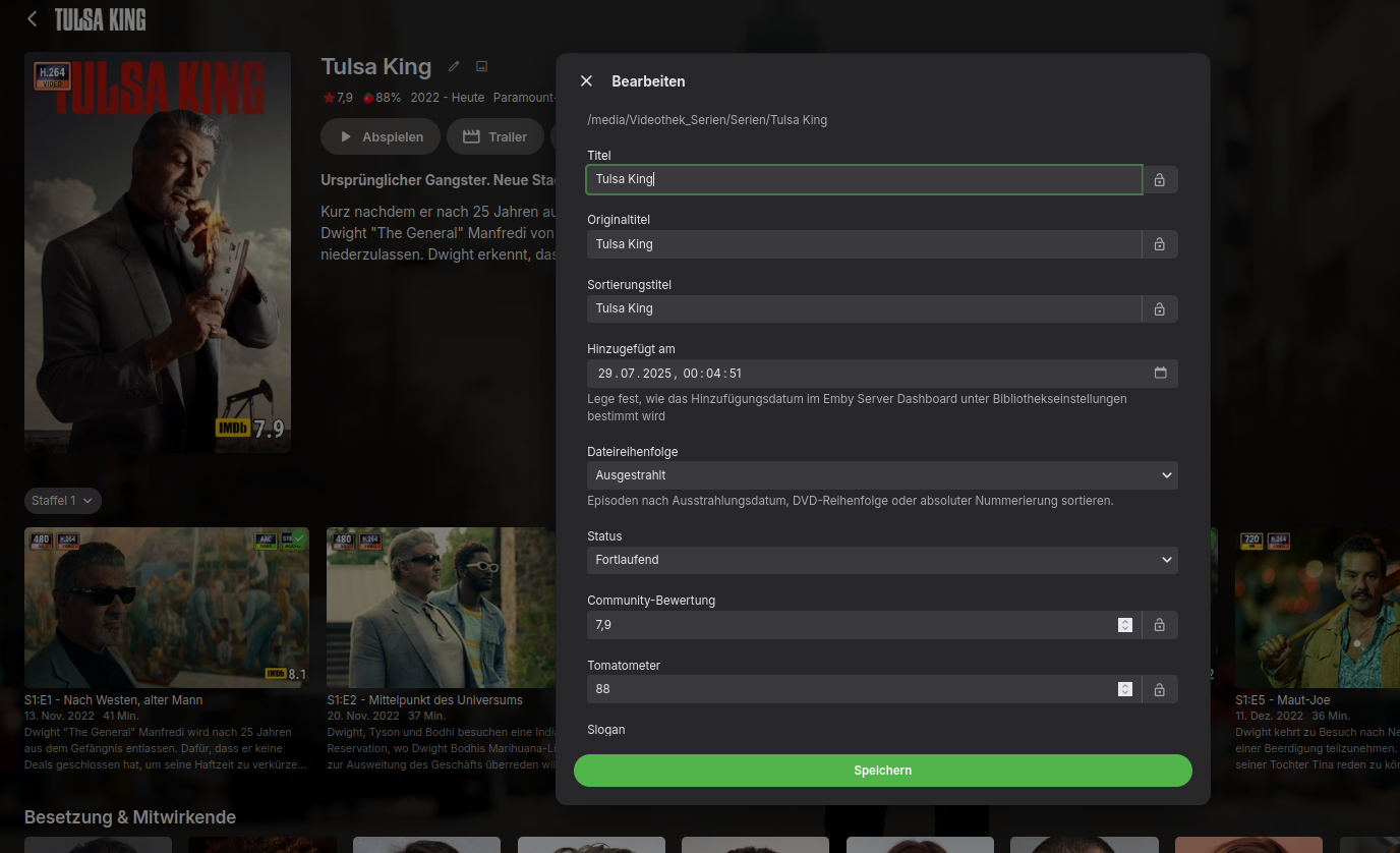 Doppellhelix 17 Posted January 28 Posted January 28 18 hours ago, yocker said: I don't know how Ratings Sync work so it hard to say. Try and do a rescan of the libraries. Hi, thanks for your reply. It looks like Ratings Sync simply updates the ratings and then enters them into the metadata. In the Scrrenshot, you can see that Rotten Tomatoes has a rating, but it is not displayed on the cover. I rescanned the Emby library and also updated the metadata for Tulsa King. That didn't help. It looks to me like EmbyIcons needs to scan the library again to recognize that a change has now taken place in the metadata. How can I get EmbyIcons to do that? Greets Helix