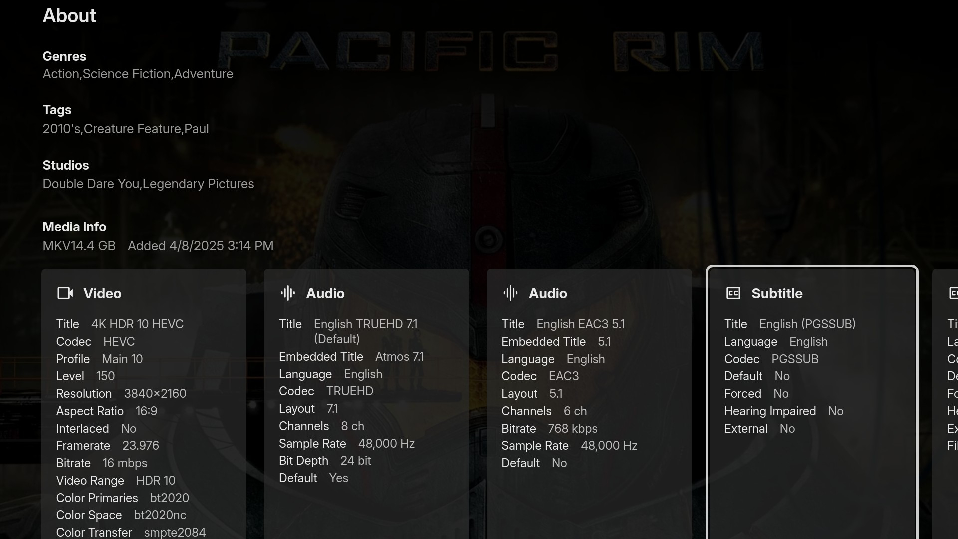 marriedman 85 Posted May 16, 2025 Posted May 16, 2025 Just spit-balling here, you said you recently deployed this? This scan of your movies, is this the first initial pass? If so, it's going to take a long time with 28K movies. Besides determining the mediainfo for all of those files, do you have chapter creation enabled? Chapter thumbnail generation too? Are you scraping metadata from the internet? Is your media fast hard drives or slow? Also, is the storage on the same hardware as emby or is it on SMB/NFS shares? If so, how it the network speed? All of these things will take time on the first scan. If you expand to TV Shows, the intro skip will also take time. You don't really need to answer any of these questions, they are just there for information and consideration. I believe I have a pretty substantial library: 41,398 Episodes 2,294 Movies 104 Music Videos <100 Home Videos 50,315 Songs That took well over a day, could have been two. On trick I literally just learned was that you can tail the log file and see in real time what emby is doing. So I ended up just tailing the log and checked on it every once in a while. Once that initial scan is done, you can set emby to watch your library for changes or schedule the scan for the middle of the night. I have mine set to watch an it's very fast in my opinion and there is no impact to performance on my much older hardware. I've attached an example of all the mediainfo that emby is scanning. That coupled with the genre, actors, studio, years, etc... makes for some pretty powerful filtering capabilities. Stick with it and I bet you will be thoroughly impressed with emby's performance.