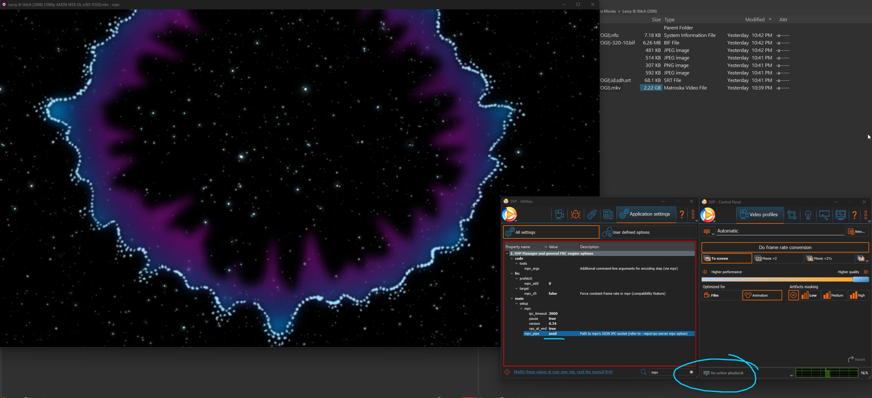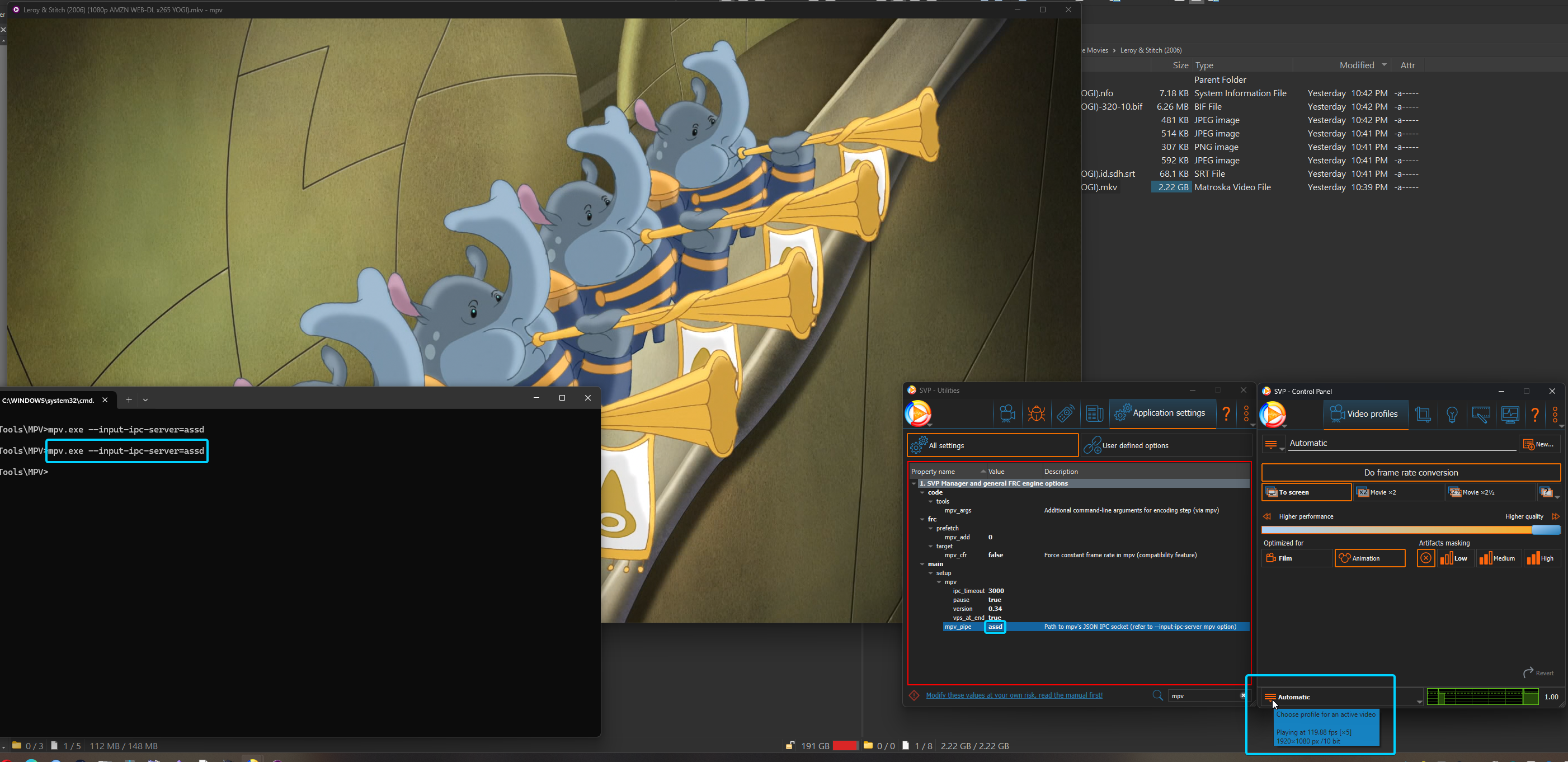 Riezel 33 Posted May 31, 2025 Author Posted May 31, 2025 (edited) 42 minutes ago, Luke said: Hi, what params would you need to be able to do this without a custom mpv build? well for starter, as simple command like this --input-ipc-server=xxx this is normal version without param (svp didnt detect it) and this is the mpv run with proper param matching the config in svp so i can match the ipc server (in this case assd) and svp detect it and convert it into 120fps mode on side note, in older version of emby-theater windows (non store) you can just add emby-pipe in svp config to natively detect emby player within emby-theater Edited May 31, 2025 by Riezel