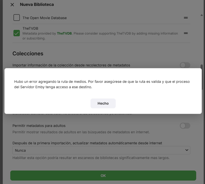 DennisQR 0 Posted May 18, 2025 Posted May 18, 2025 hola, tengo problemas con acceso mi carpeta de peliculas, me sale el siguiente mensaje, Hubo un error agregando la ruta de medios. Por favor asegúrese de que la ruta es valida y que el proceso del Servidor Emby tenga acceso a ese destino. lo curioso es cuando instalo un version de emby beta , no me da ningun error , pero cuando uso una version estable , me sale el erro que no tengo acceso a ese destino.