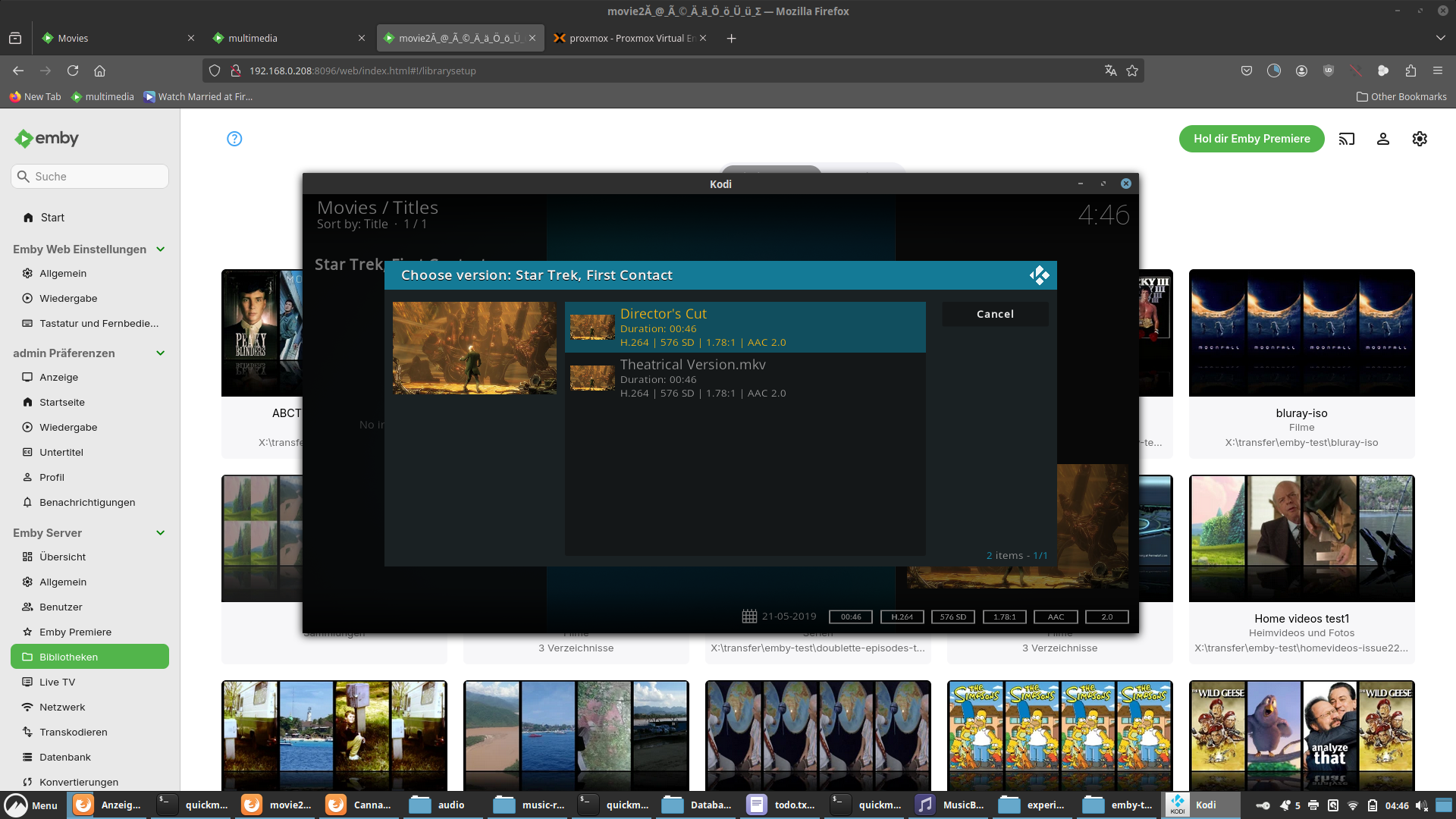 redcuts 2 Posted May 20, 2025 Posted May 20, 2025 (edited) Hallo, ich nutze das Emby Addon für Kodi und habe ein Frage zur Darstellung verschiedener Filmversionen in Kodi. Ich habe in Emby einen Film als Theatrical Version und als Director's Cut eingelesen. In Emby selbst wird das auch perfekt in einem Eintrag dargestellt und zur Auswahl zur Verfügung gestellt. In Kodi erhalte ich ebenfalls nur einen Eintrag. Beim Anwählen öffnet sich die Versionsauswahl. Soweit, so gut. Allerdings erhalte ich keine differenzierte Benennung. Beispiel: Speicherpfad Film (2019) |-- Film (2019) - Theatrical Version.mkv |-- Film (2019) - Director's Cut.mkv Auswahlfeld in Emby Film (2019) Theatrical Version Director's Cut Auswahlfeld in Kodi Film (2019) Film Film Habe ich hier etwas falsch eingestellt oder ist Darstellung in Kodi nicht möglich? Edited May 20, 2025 by redcuts