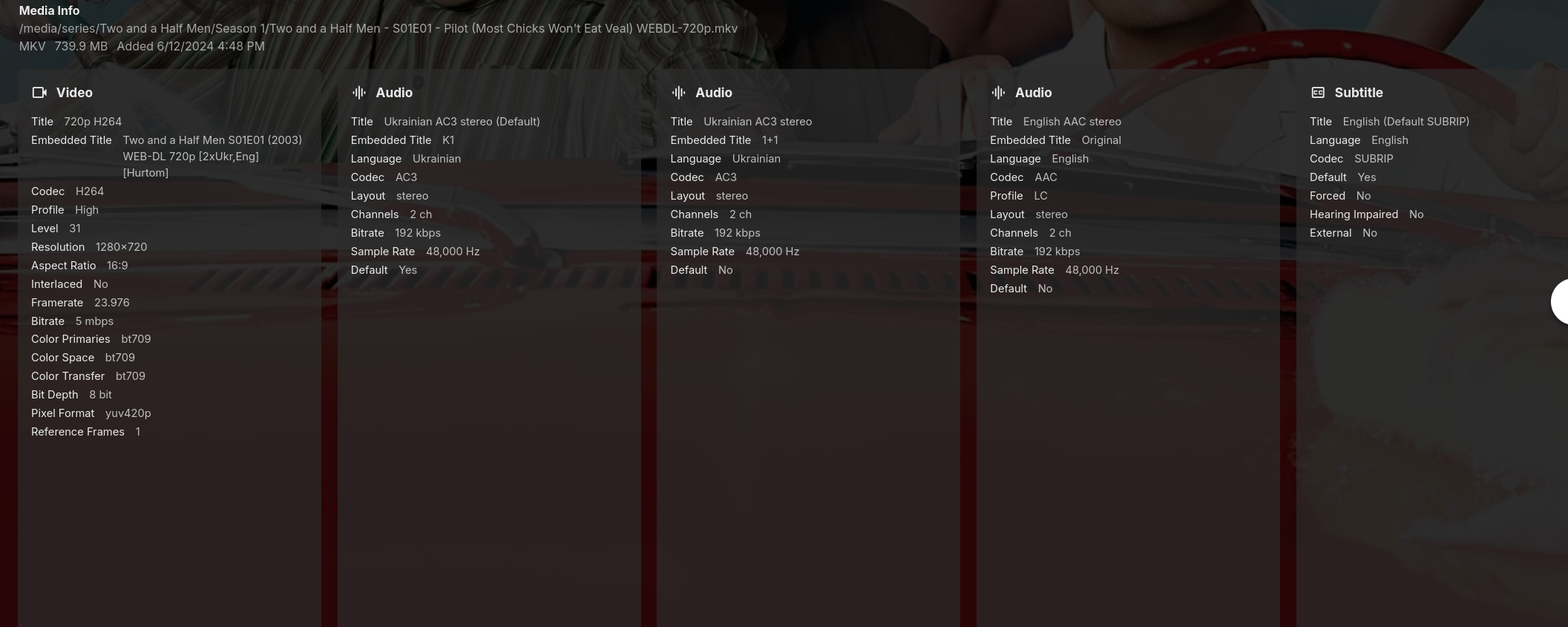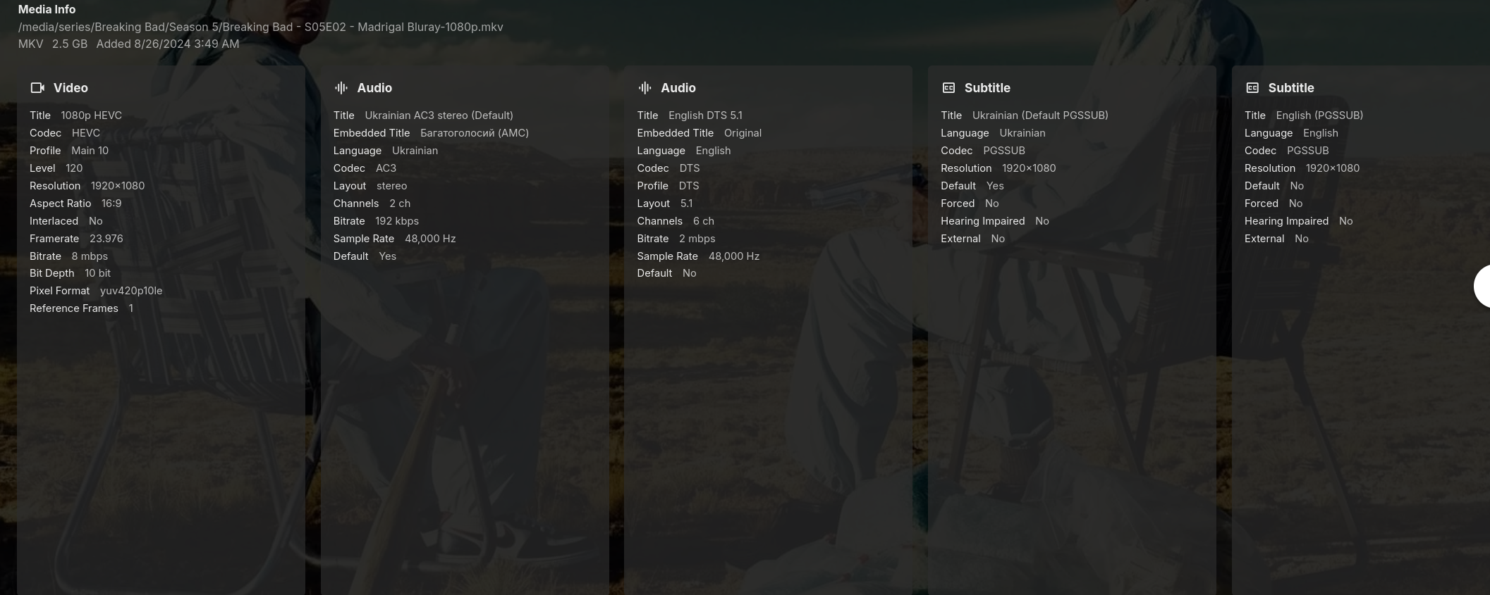 visproduction 315 Posted July 18, 2025 Posted July 18, 2025 (edited) Is there perhaps a problem in selecting 2nd or 3rd audio in multi audio media. What is suppose to happen when the users selects an alternate audio, during playback? Is the current media playback, suppose to stop completely, lock in the alternate audio and then start over again from on the same second on the timeline? Is there any delay in doing this audio switch? Does a new check for the video / audio combination need to be run to see if direct play can still work with the new audio codec? Would checking for that, cause a delay? HEVC video often needs transcoding to play back. Is Breaking Bad HEVC video playing back directly? I suppose you can see all this in the logs. I'm just listing some things to look at? I would guess having multiple audio tracks contributes to this. What do the logs show? I am not taking the time today to look at them. If you can't see from the logs, maybe remuxing the video with one audio track each, so you get 3 versions of the media. I wonder, would one these not play back? Can there be timeline data errors inside an audio track that do not show up with you test the file? Can other software handle the audo switching better or fix audio timeline defects? I don't see another way to narrow this down. If you keep trying to get 3 embedded audio tracks to work, without separating them out, how do you ever find out which is causing the problem? Edited July 18, 2025 by visproduction