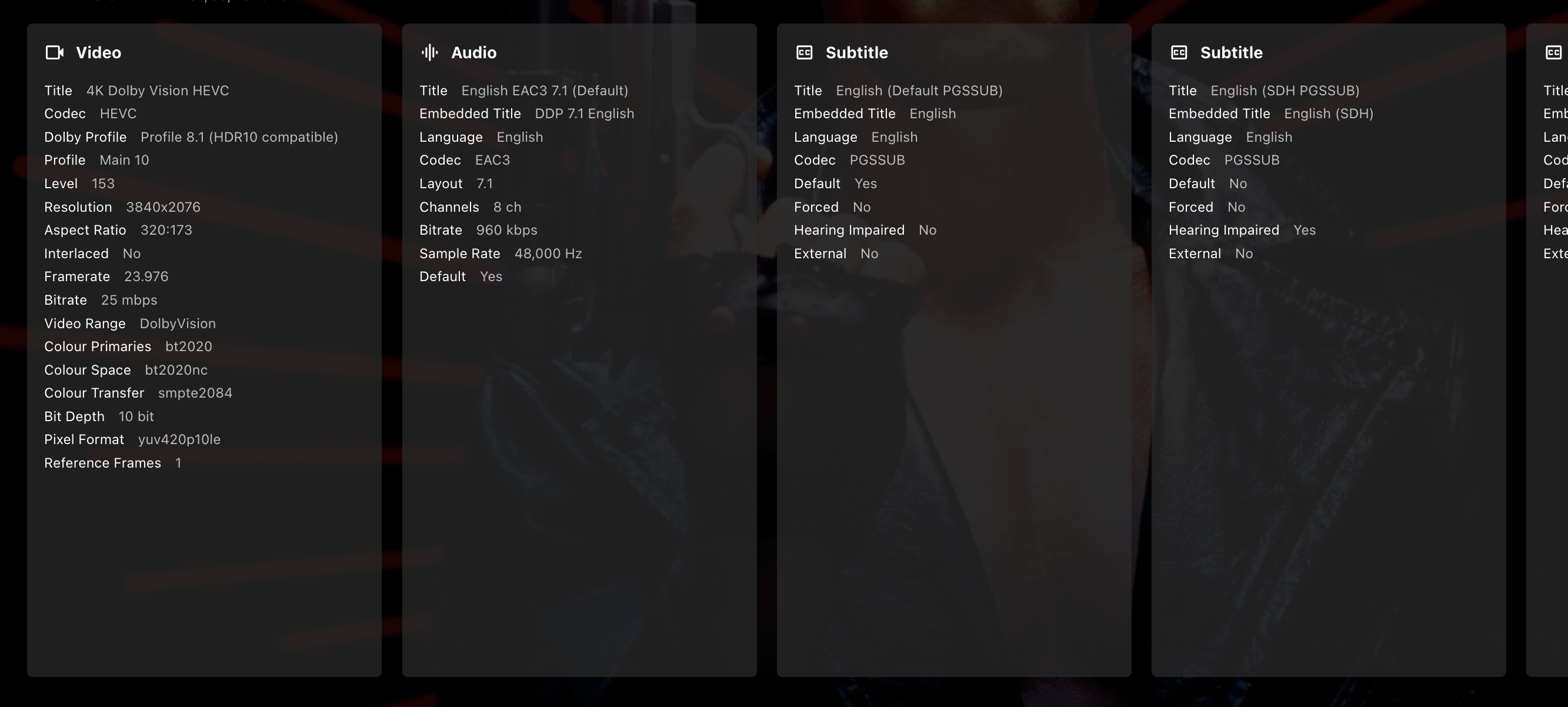 SamES 1056 Posted July 17, 2025 Posted July 17, 2025 It's not a DTS issue, that model TV still supports DTS. @Darkel_91, thanks for the media info. Can you please also copy the media info block that is at the bottom of the details page for those movies on the server. I'd like to confirm how the server is actually detecting this as well. I mean in the format below, just be sure to scroll across if required to get all the streams. You may need to do multiple screenshots to get it all. Just to clarify, you have 2 servers and 1 TV you are using for testing. Server 2 has no issues with any files, but server 1 has issues with some files that work fine on server 2. Is that correct? 1