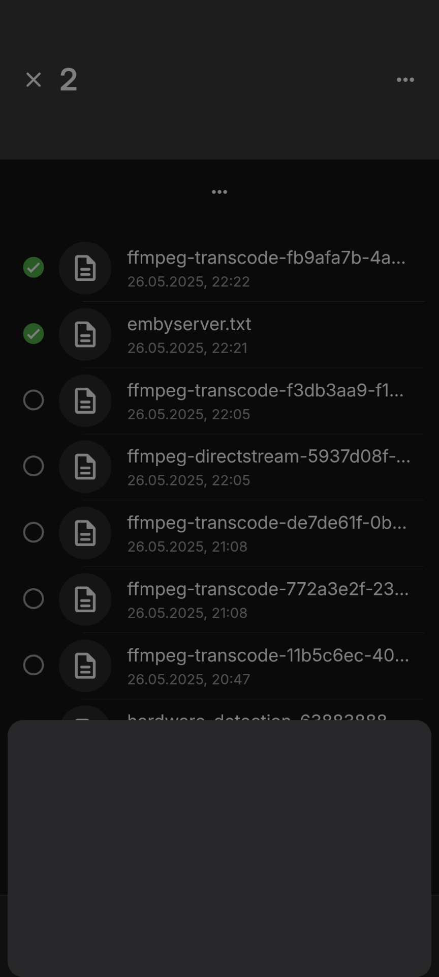 mordashevmv 1 Posted May 26, 2025 Author Posted May 26, 2025 embyserver.txt ffmpeg-transcode-fb9afa7b-4a90-4c66-afad-7b0cc72c8435_1.txt ffmpeg-transcode-f3db3aa9-f1ce-4e6e-93c6-3e72c22110b4_1.txt ffmpeg-directstream-5937d08f-7ba3-4f98-9127-e061cfeec512_1.txt