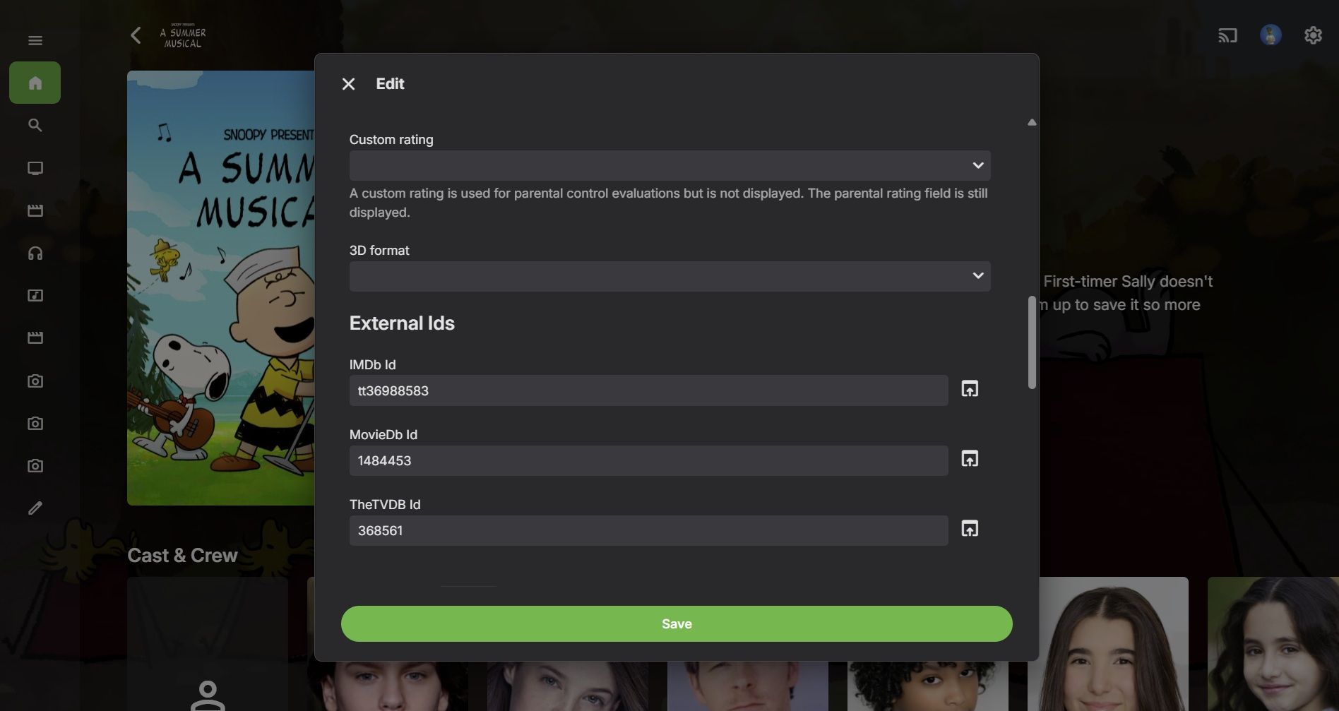 Happy2Play 9780 Posted September 7, 2025 Posted September 7, 2025 (edited) 6 hours ago, Davey's said: With the current stable version 4.8.11.0, it's currently not possible to identify content. I'm trying to identify Snoopy Presents: A Summer Musical 2025, both automatically via the IMDB ID and manually, but nothing works. I also tried this with other content, and it works. Sorry but this is a provider issue not a Emby issue as it only exits that way via OMDB via TV content type. 2025-09-07 09:47:03.555 Info HttpClient: GET https://api4.thetvdb.com/v4/search?type=series&q=tt36988583&remote_id=tt36988583 2025-09-07 09:47:03.682 Info HttpClient: GET https://api.themoviedb.org/3/find/tt36988583?api_key=apikey&external_source=imdb_id 2025-09-07 09:47:03.886 Info HttpClient: GET https://private.omdbapi.com?apikey=apikey&i=tt36988583&plot=short&r=json But yes since TMDB list it as a movie it would have to be in a movie content type unless you enable OMDB but will require manually applying things. Edited September 7, 2025 by Happy2Play