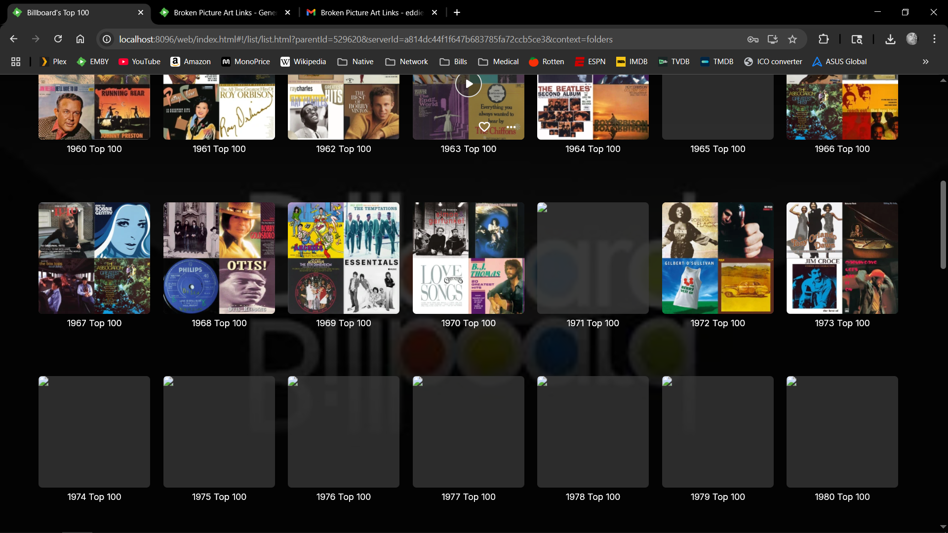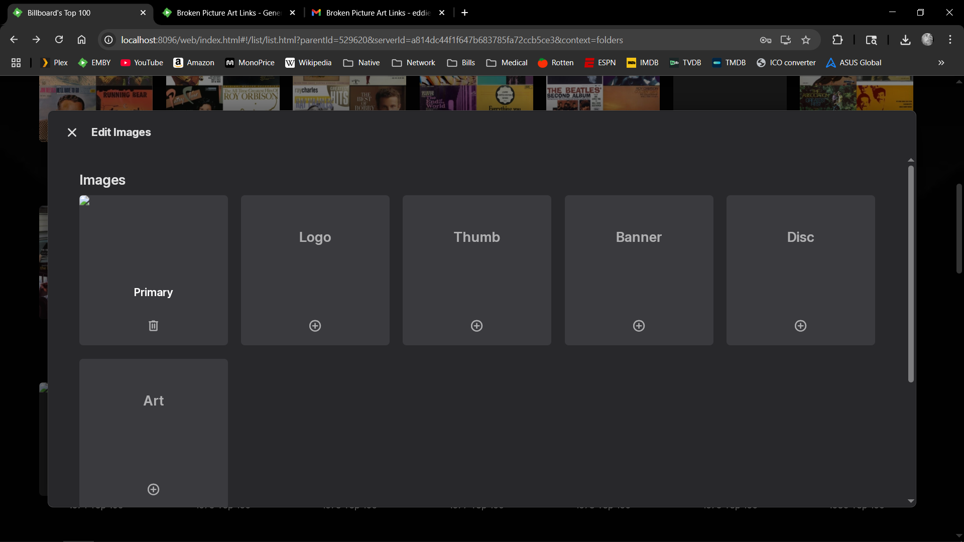 Wareagle 1 Posted June 3, 2025 Author Posted June 3, 2025 Picked a log file around the time this began. Not sure what all this says hope it is helpful. As an example: From the Home Page most artist missing and has a broken link. I chose Playlist as my example in pic2. Then I chose Billboard Hot 100, pic 3. You see the missing/broken art in pic 4. I chose 1971 to show the garbage can icon. There was a photo, I can delete it but I cannot upload a new one. Tried several different methods nothing works. embyserver-63884322126 05-31.txt
