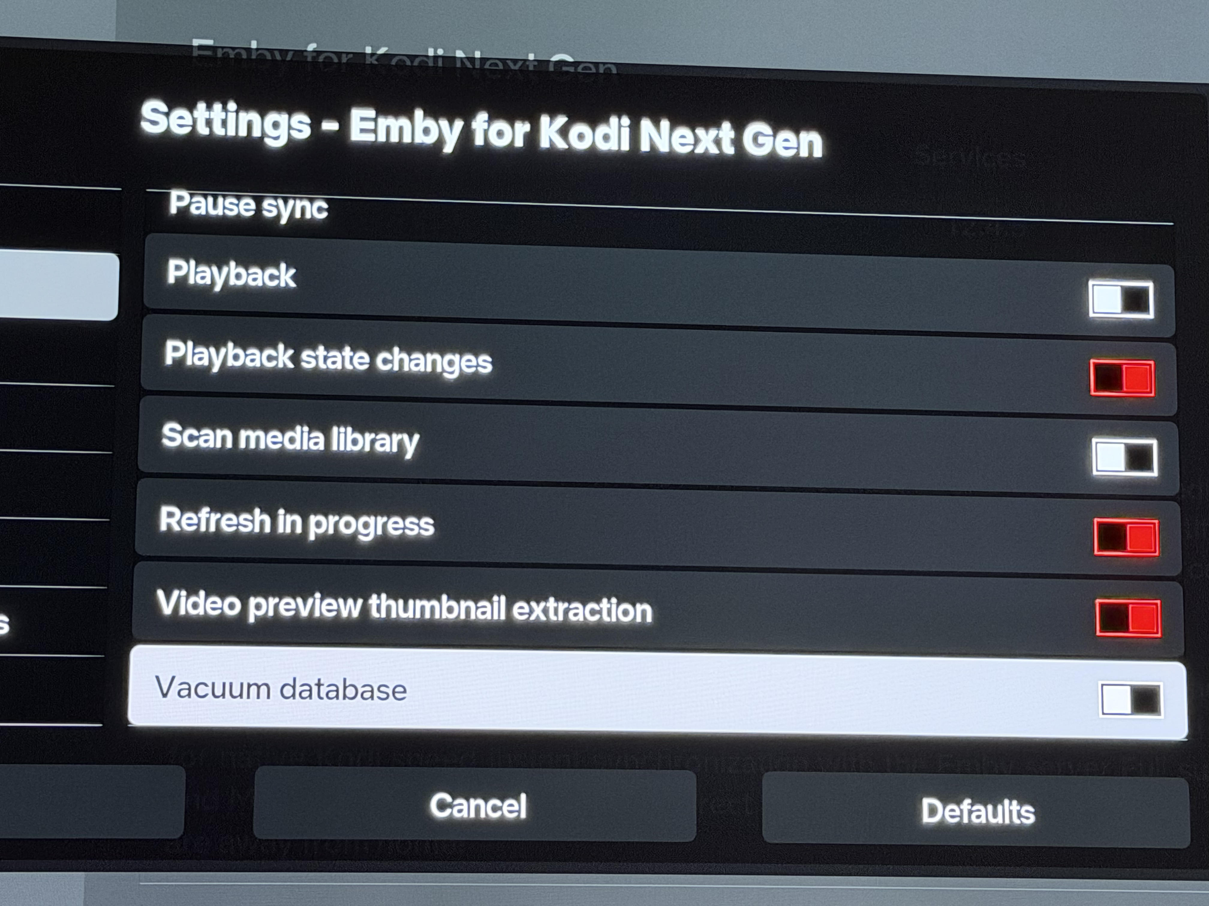 geowill76 8 Posted January 21 Posted January 21 I have gone into sync settings. Have attached screenshot. Playback shows as grey and not red. Does that mean sync shouldn't happen during playback? So far the only option that has stopped the notifications happening during playback is by changing Scan media library to grey and not red. Will that cause problems? Reason I ask is that I am trying different settings in the Pause sync options and now when I stop/close a video, Kodi is crashing/rebooting.