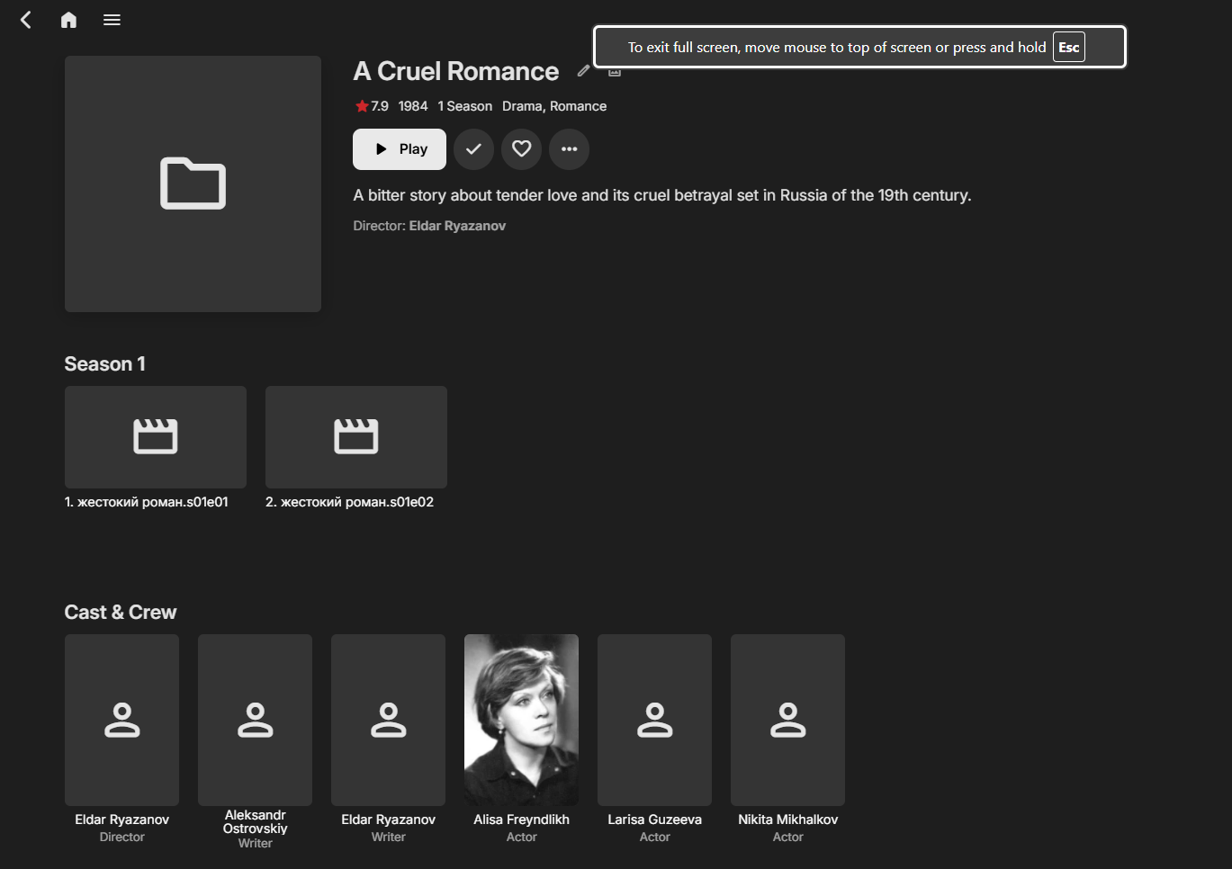 WingDog 16 Posted June 30, 2025 Author Posted June 30, 2025 (edited) 18 minutes ago, Happy2Play said: What exactly did you do? let's sync our clocks. are we telling about this matching problem? 5 hours ago, WingDog said: Ops! https://www.themoviedb.org/movie/66091 https://www.thetvdb.com/movies/a-cruel-romance if so, I exactly did the "Mixed content library" with OMDB fetcher enabled and placed there a Folder named "MovieName (year)" and two episodes named MovieName (year).s01e01.mkv after automatic identification this movie was matched as this is not correct. than I tried manual identification but got incorrect results. the is no OMDB field in the manual identification form, so I didn't check that Movie via OMDB. now I checked OMDB - this Movie is not in it. 18 minutes ago, Happy2Play said: I guess if you can type that name, I can copy and paste it to test it. here "жестокий романс" Edited June 30, 2025 by WingDog
