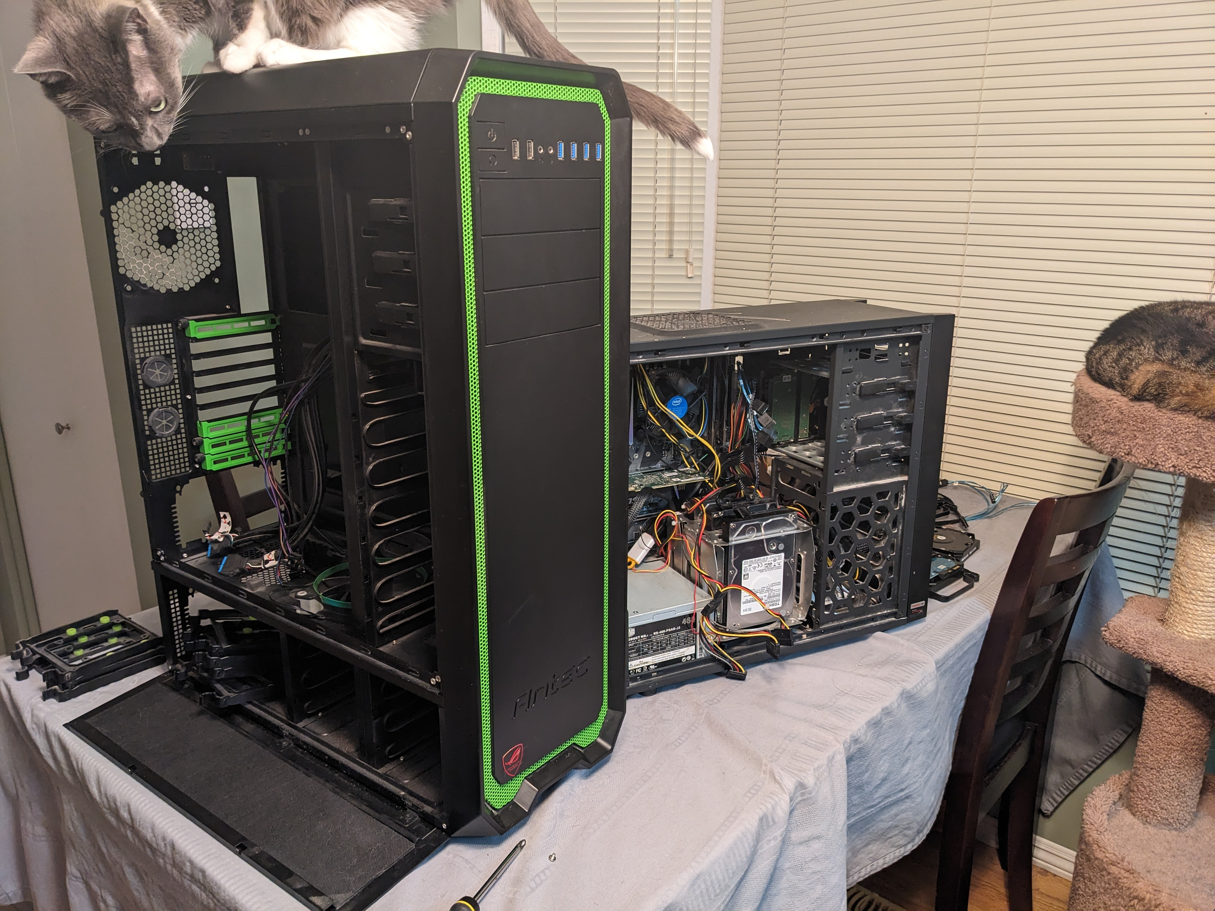 Jdiesel 1431 Posted June 27, 2025 Posted June 27, 2025 (edited) My setup isn't pretty as it is tucked away out of sight and out of mind in my crawl space. I did grab a few photos during my last upgrade though. Previous Build Intel i5-8700 16GB RAM 1TB NVME 8x 12TB SAS HDD 2x LSI 9211-8i SAS HBA Antec One Hundred Case New Build AMD Ryzen 9 7950x 64 GB RAM 1TB NVME 2TB NVME 16x 12TB SAS HDD LSI 9305 16i SAS HBA Antec Nineteen Hundred Case The server OS is unRaid with various dockers for media, home automation, and other hosted services. Upgrade was done to support future local LLM needs. I'm currently looking for two Nvidia RTX 3090 GPUs. Emby Details 1 local user and 6 remote users Clients are almost exclusively Android or FireTV (90%) A few users occasionally use mobile devices (both Android and iOS) One Roku client One Xbox client One Emby Theater client Library consists of 1080p content only, a 4K library is available to only my local account IPTV source for Live TV AMD iGPU HWA is being used via VAAPI (works fine for 1080p SDR content but the Intel i5-8700 was better, HDR tone mapping does not work under Linux) What makes my Emby setup special is that the Emby install/database I'm using dates all the way back to 2018. No fresh installs, no crashes, just upgrade after upgrade for the last 7 years. I have been using Emby (MediaBrowser) since it was a Windows Media Center plugin. Edited June 27, 2025 by Jdiesel 3