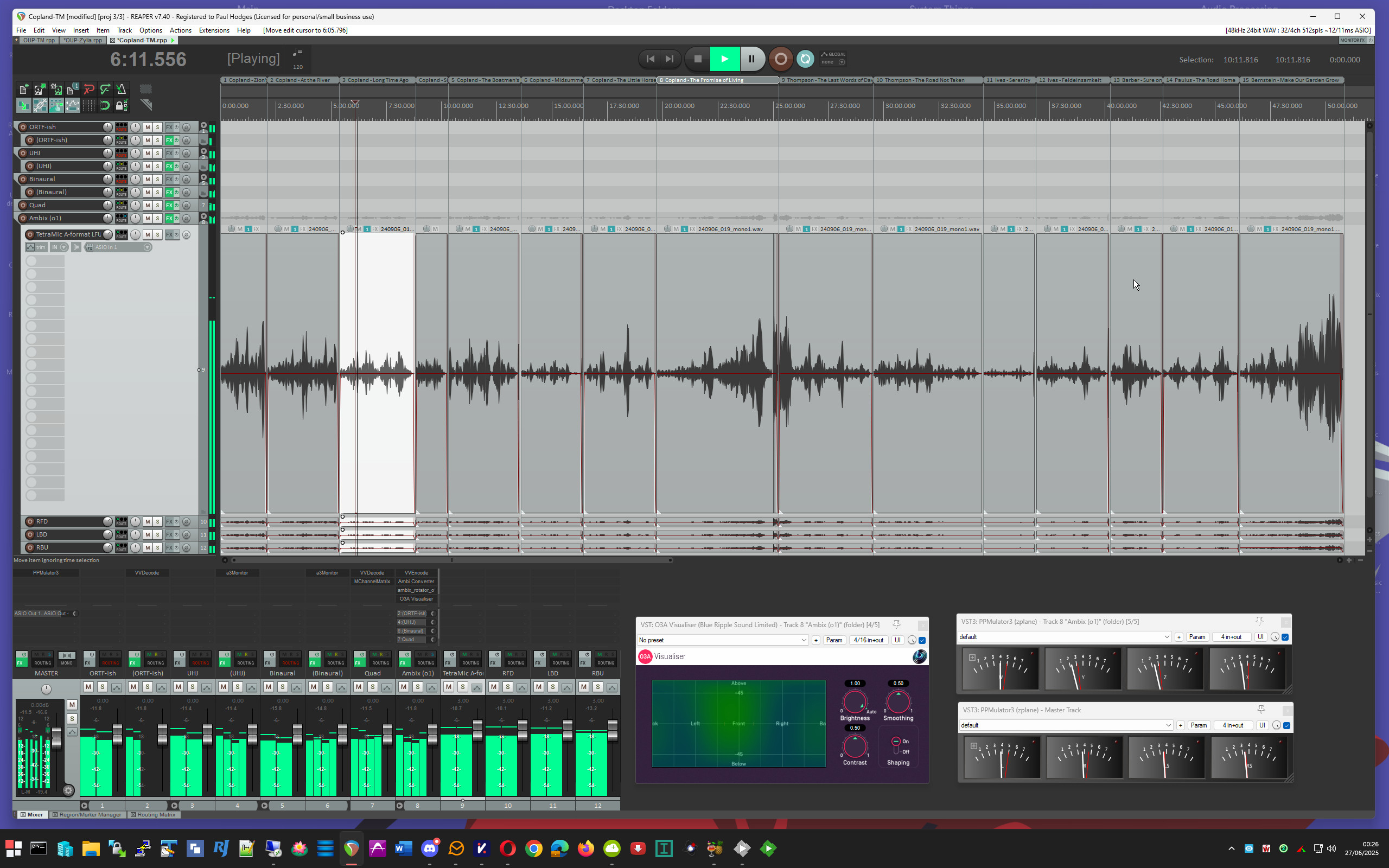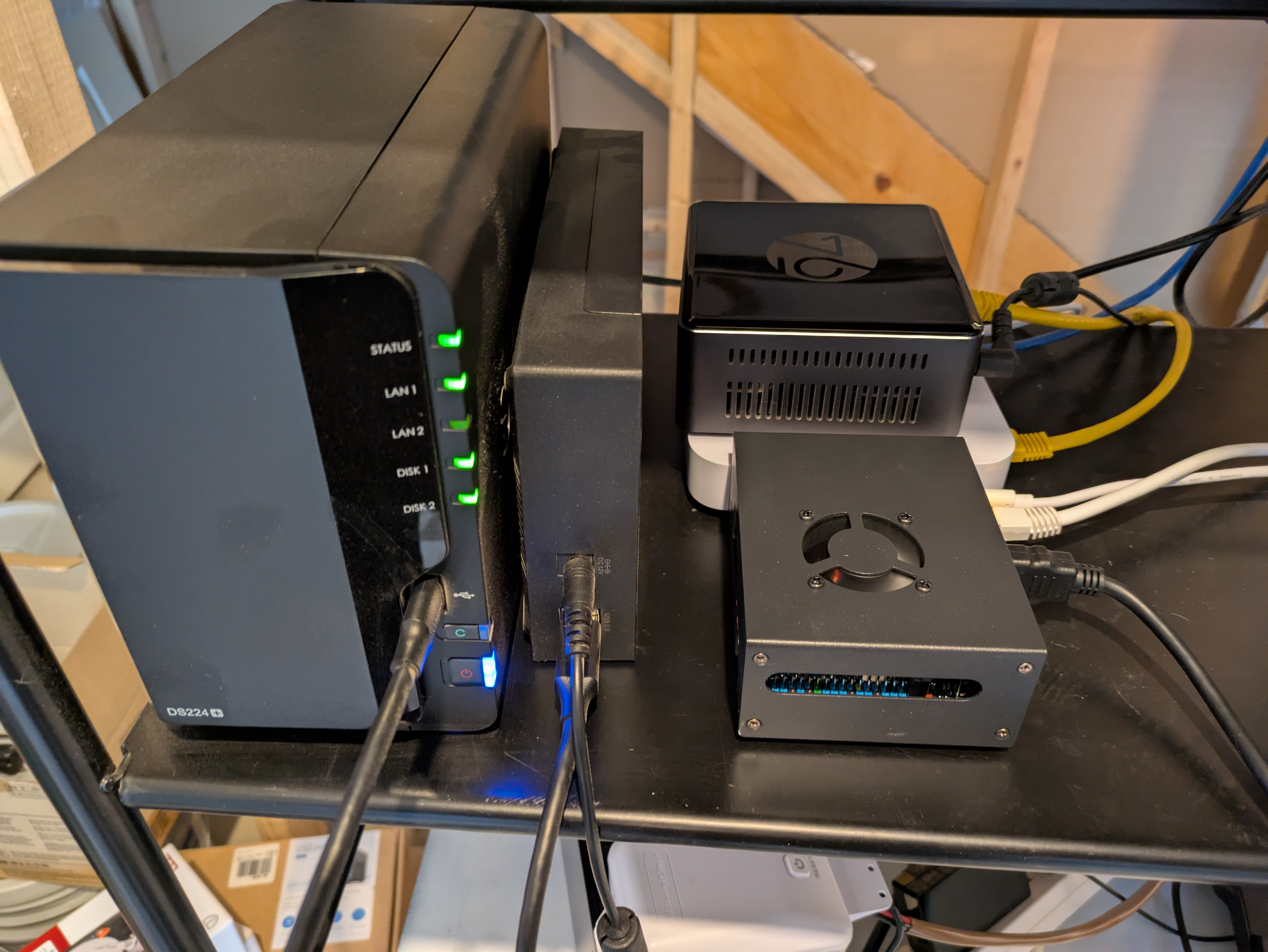 pwhodges 2012 Posted June 26, 2025 Posted June 26, 2025 My Emby server is an i7-3770 with 16GB memory and an nVidia GTX 1050Ti for transcoding. It is running Windows 10, and is controlled remotely using RDP. The disks are: (1) 500GB SSD for the system - also the Emby program and temp directories; (2) 12TB disk for the permanent media store (video and audio); (3) 6TB disk for TV recordings and torrents. The server runs nothing other than Emby and Deluge. The media library is curated on a large disk on my desktop (a far more powerful machine with loads of audio editing software and my concert recordings for the last 50 years on it). The local media disk is then mirrored to the server every night. This setup means that no additional backup is required. Clients in regular use are: (1) Roku TV in family room; (2) Roku stick for travel; (3) Firestick in the guest room; (4) iOS on a tablet when lazing around; (5) Theatre on desktop machine when convenient (the screen is a 30" HP screen - I had a 30" Apple Cinema Display, but it became unusable and unrepairable). The "server room" is a corner in the attic: On the left a big UPS with an HDHomeRun sitting on it. In the middle two machines which are internally identical - an 8-core atom processor with 32GB and several SSDs - these run HyperV core (no GUI) hosting a domain controller, a print server, and a jack-of-all-trades web machine with a Caddy web server (about 8 sites) and reverse proxy, a Tomcat server, and a mail server (Kerio). These virtual servers are split between the HyperV hosts to balance the load, and are replicated (mirrored every five minutes for a warm backup). On the right the lower machine is the streaming server (Emby and torrents), and the HP on top is an old backup machine. The streamer is the only machine powerful enough to have a cpu fan! Above you see the central network switch and a distributing TV amplifier feeding the main and guest TVs, the HDHomeRun and a Hauppauge card in the streamer (not currently in use). Not seen, because in a different room, is the Draytek Vigor 2860ac router/firewall. Of more specialist interest is my desktop while editing a concert (this on was last Sunday, in fact): Enjoy! Paul 3