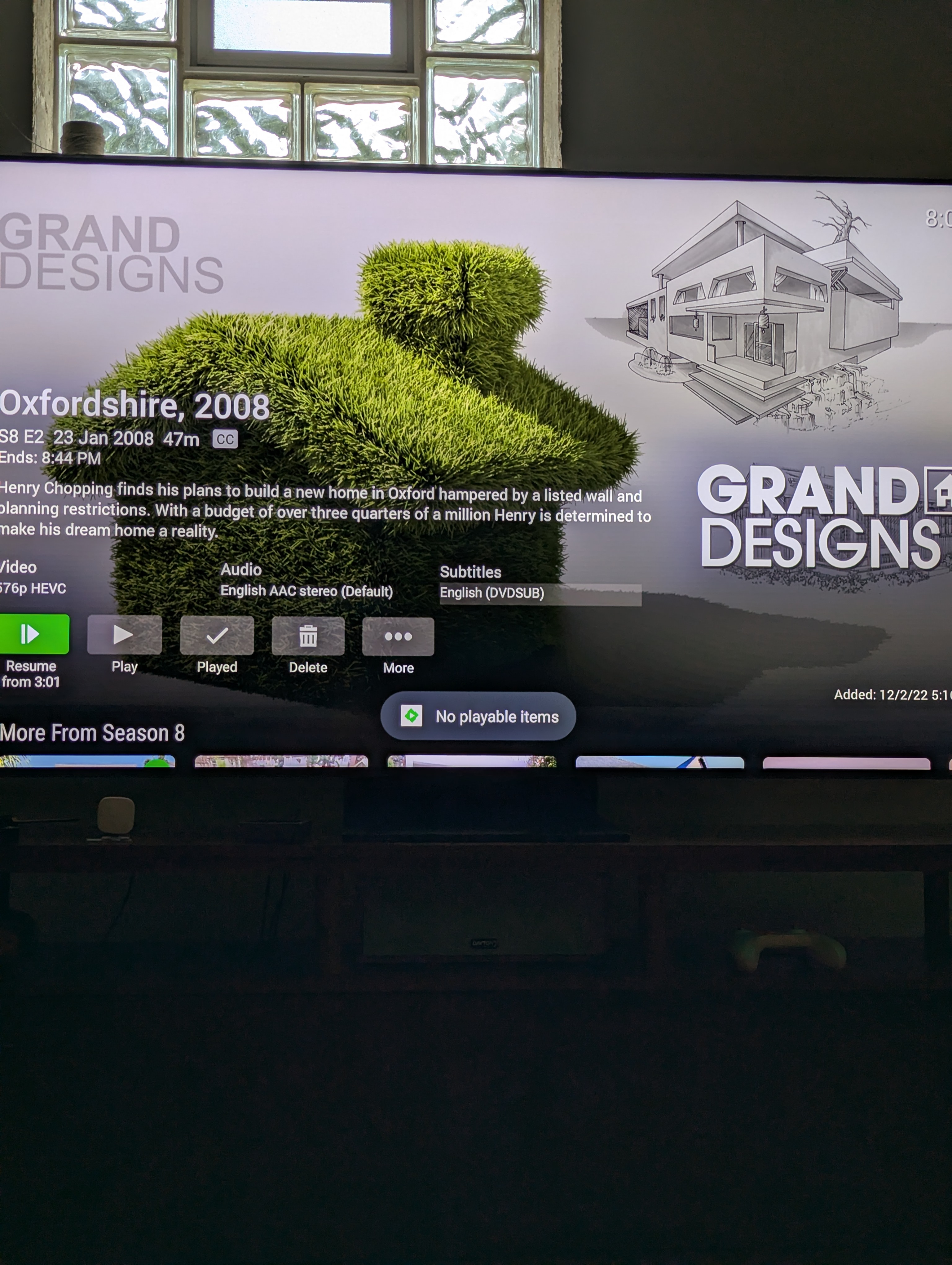 mynextemby 0 Posted June 30, 2025 Author Posted June 30, 2025 On 6/27/2025 at 8:11 AM, ebr said: Hi. And then exactly what happened? What is the name of the server you were attached to? Sorry for the late reply I was out of town. Emby server name - WACKYDELIYEAH I recreated the issue again today 6/29/2025 and outlined and included a more detailed description, resent logs from android tv and attached server log and a photo here. 7:57pm eastern time - started playing "grand designs" from TV Shows library ~put remote down and let it time out and go to sleep~ 7:59:05pm remote went to sleep. Playback of show stopped abruptly. At the bottom middle of the screen a bubble displays "no playable items" (see photo attached) I repeated the same thing with other apps like youtube and any similar issue does not happen. I only experience this when playing in Emby. Thank you, Jake embyserver.txt