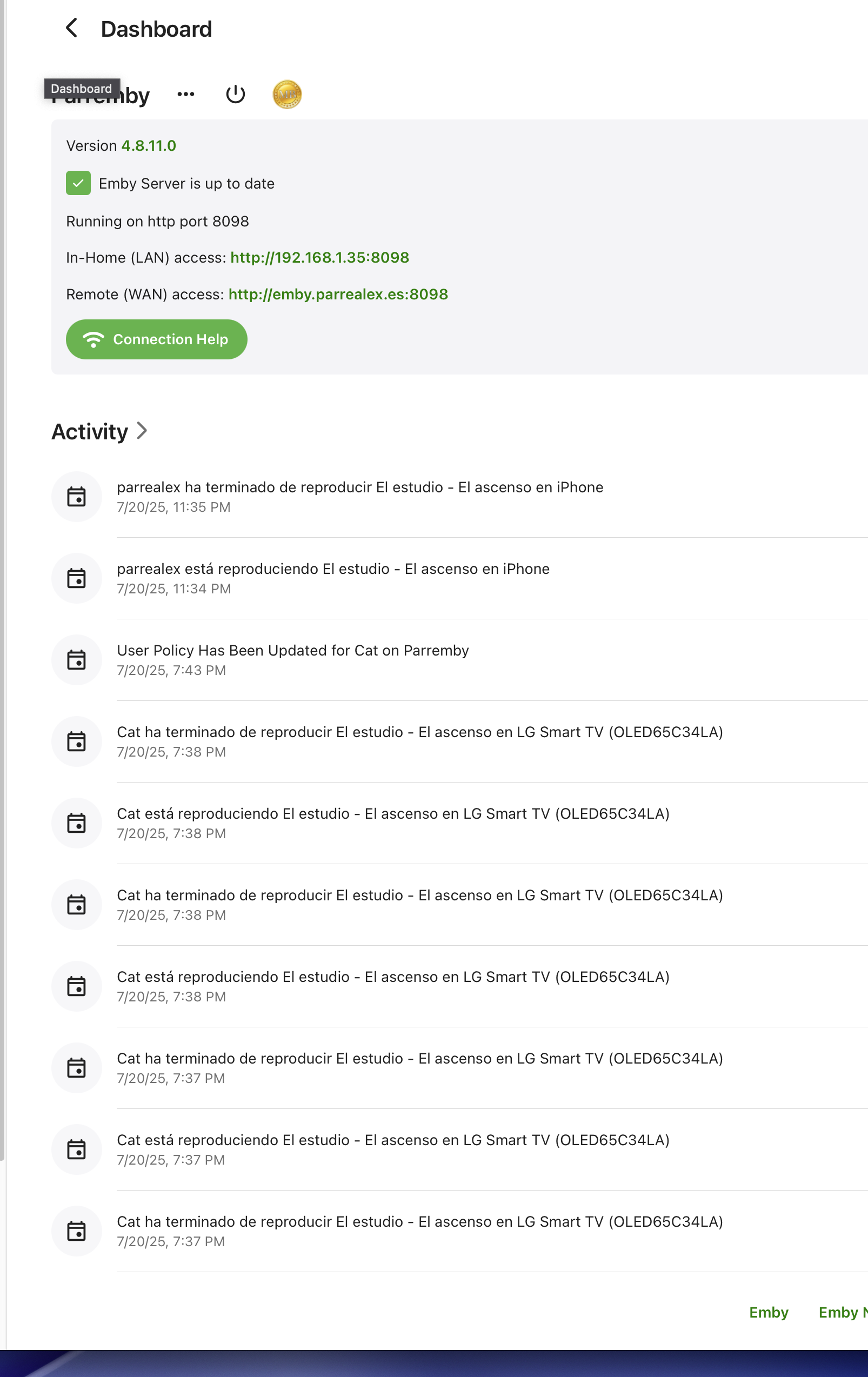 parrealexander 0 Posted July 20, 2025 Author Posted July 20, 2025 We all have the latest version of emby and all of them. I'll tell you. In my house I have my NAS asustor, with the Emby docker installed. I have an LG C1, I don't have any problem. Sometimes with the movies that I'm very heavy of many gigs maybe it hangs up for a few seconds but then it looks perfectly. I have 2 friends, with two LG TVs, and none of them can watch the movies I watch. I don't understand why and I'm already desperate. I try not to transcode and play directly, I in the iPhone control panel I see that my friend is playing directly, but she tells me that it does not work, that it does not load. On the other hand, my other friend, if he can watch the movie but at the moment when the pause, or wants to go to a point forward or back of the movie, he can no longer continue watching it. I'll put the screenshots so you can see how I have configured emby to see if you see something that is wrong. embyserver-63888652800.txt embyserver.txt