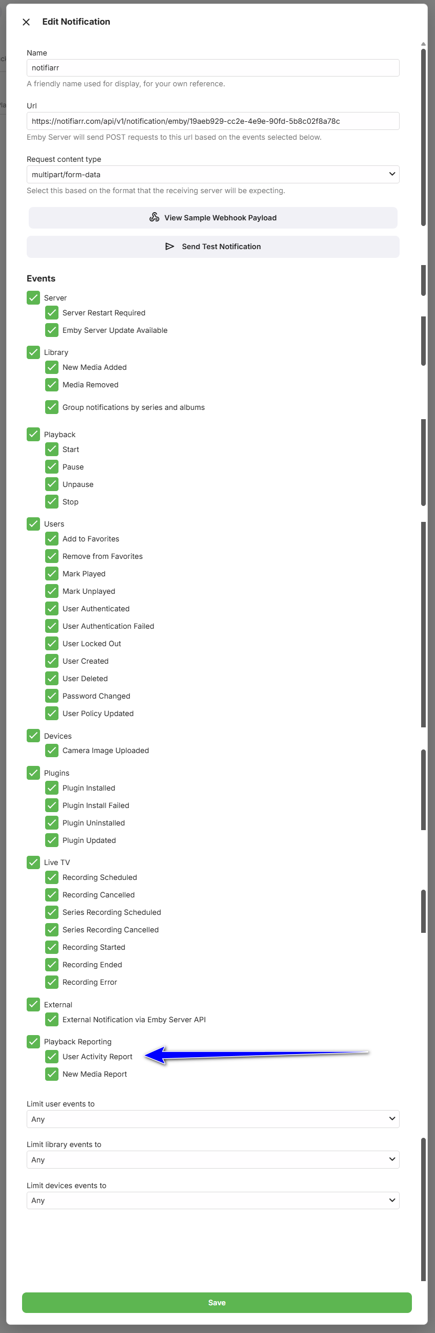 richardvrusso 13 Posted July 9, 2025 Posted July 9, 2025 Hi everyone, If I missed it somewhere please let me know. I'm playing around with webhooks. I have the Playback Reporting plugin installed. It will send through email a daily 'user activity report' but not through the webhook. All the other checkboxes will send a webhook notification. I looked through the embyserver.txt log but only found limited entries. Then I turned on debug logging and ran that scheduled task again. Still trying to sift through for any info. Anyone else have this issue and fixed it? Thanks, Rich