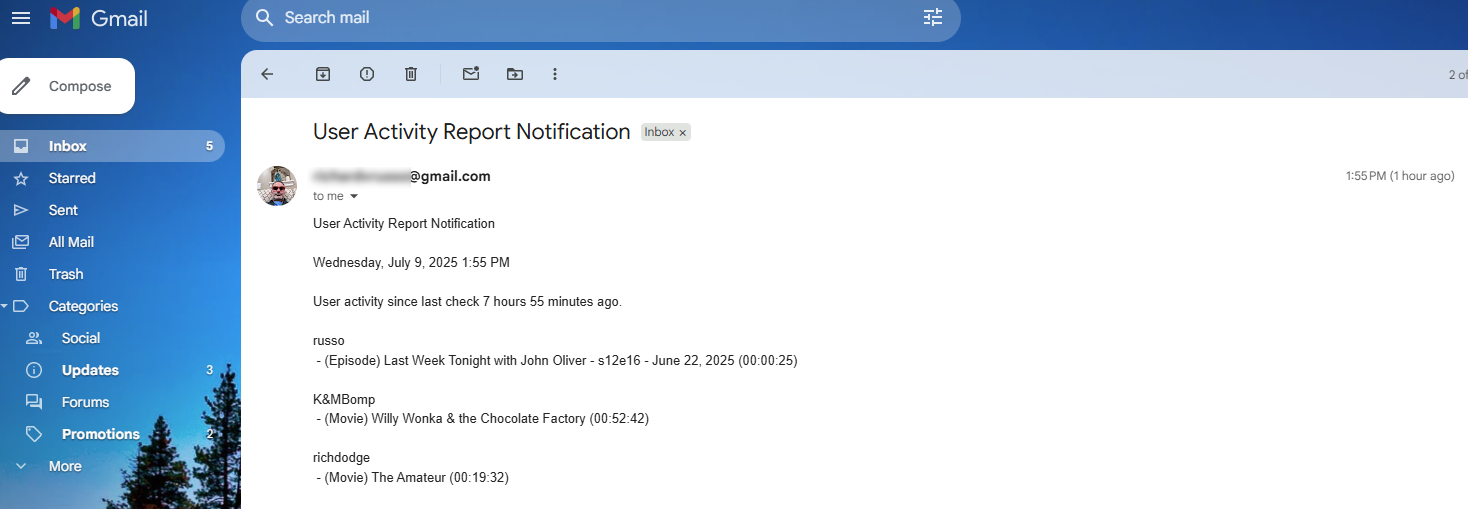 richardvrusso 13 Posted July 9, 2025 Author Posted July 9, 2025 After I turned on debug logging, I went and played 60 seconds of a show. Then ran the task, and a few seconds later, I got the email with the user activity. I didn't not see the webhook notification externally. I attached the log. Near the bottom I did notice these two lines. Which gave me the impression one was for the email and one for the webhook. 2025-07-09 13:55:30.447 Debug Notifications: Sending notification: User Activity Report Notification 2025-07-09 13:55:30.447 Debug Notifications: Sending notification: User Activity Report Notification embyserver.txt