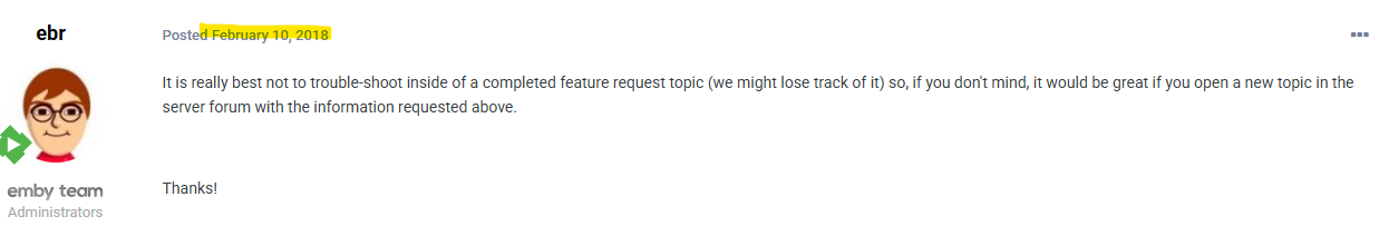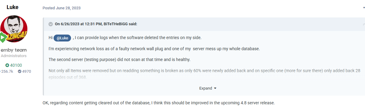 AlexisCaden 40 Posted July 9, 2025 Author Posted July 9, 2025 Thanks for this @ebr Although, it does lead to more questions... Your post: Seems to imply this has already been added to Emby. Luke's post implies it wasn't added yet: Yet the request is marked as completed, yet I am still experiencing the data wipe when the library was offline. Can you help clarify?