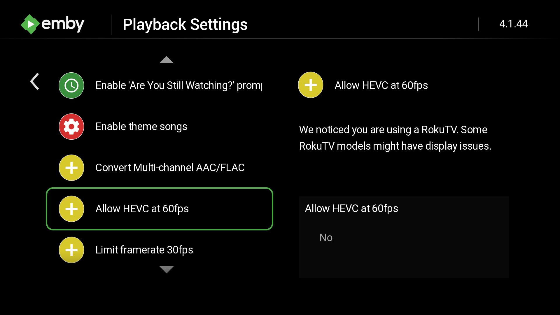 Solution speechles 2055 Posted July 10, 2025 Solution Posted July 10, 2025 We need to update the setting description since it says Roku TV. This setting applies to all Roku actually. Make sure you have this set to YES. Some Roku models claim to support HEVC @ 60fps but really are dropping frames left and right when doing so. So we allowed all Roku models to access this setting rather than just the Roku TV. We will update the setting description to remove that mention of Roku TV and that some Roku models are limited. 1 2