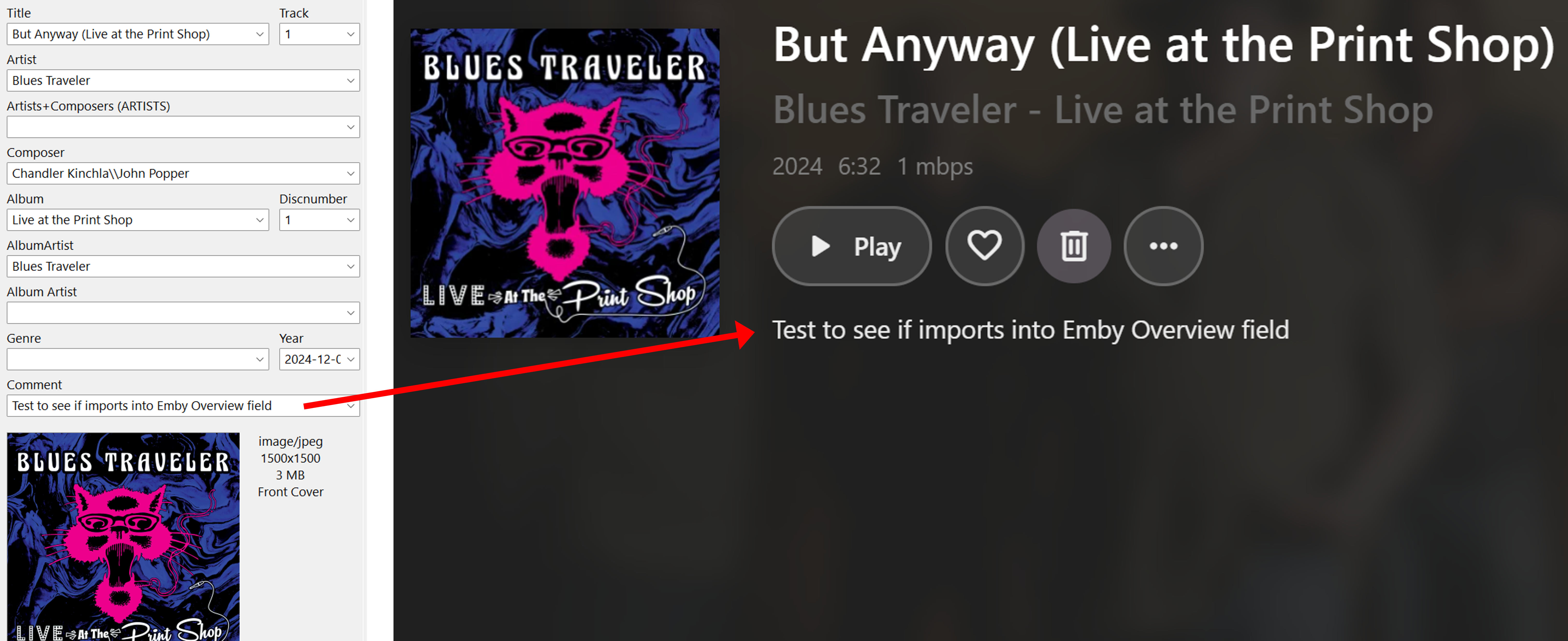 user24 313 Posted July 30, 2025 Posted July 30, 2025 This may or may not be your problem, but... with audio FLAC files at least, the COMMENT tag on an individual song/track will be imported into the Emby Overview field for that song/track only. I just did a test to double check: The Comment Field/Tag isn't usually in the default Tag Panel, but you should be able to see it in Mp3tag (if used) with Extended Tags. If you are using other file formats, then the tag name may be slightly different? Or, the problem may be something else altogether??? Cheers.