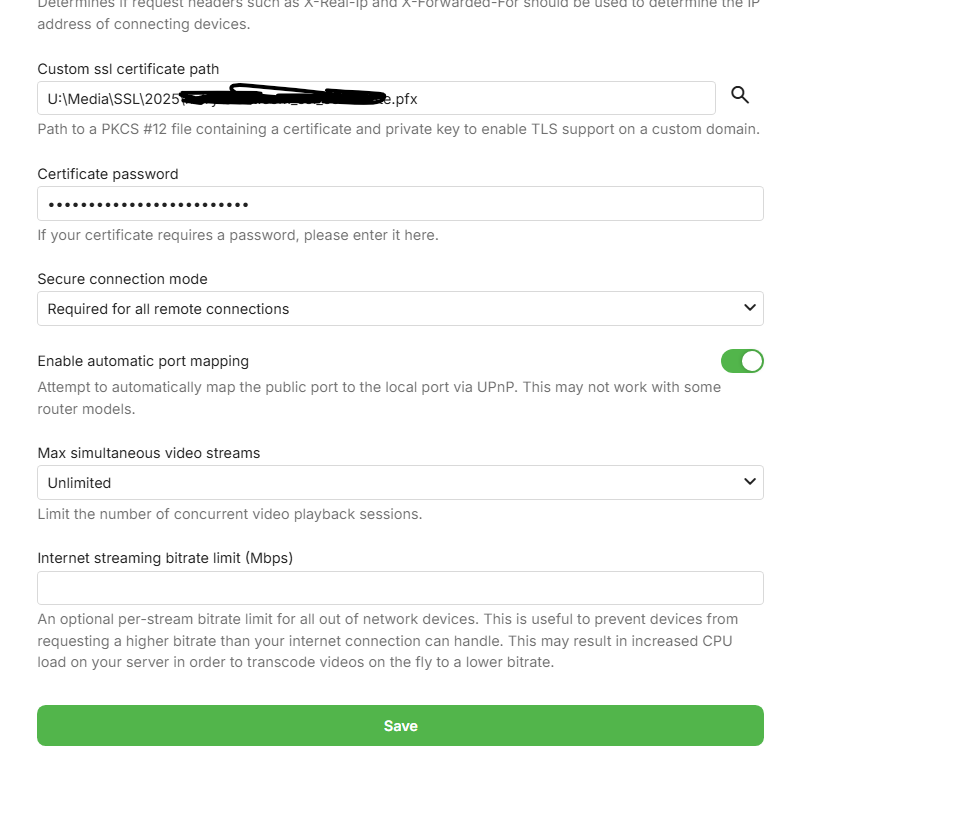 HairyBizRat 21 Posted July 30, 2025 Posted July 30, 2025 My SSL certificate expired so i renewed it with my Domain hosting site and ensured Emby is pointing to the new file, password is correct and Secure Connection is set to required for all remote connections. any help is appreciated Previously i set this SSL up last June and everything worked fine but since i only did it once a year ago i may have screwed something up with the renewal