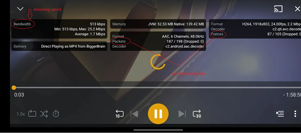 Denis_Nikolas 0 Posted August 2, 2025 Author Posted August 2, 2025 (edited) 37 minutes ago, ebr said: Hi. The progress bar on the OSD shows the buffered content in front of the current progress. Hello, but this is very uninformative, and could you tell me how to view this, it doesn't show up for me 59 minutes ago, Neminem said: @Denis_Nikolasshow a screenshot of what you want or something to compare it to Sorry for the quality, but I couldn't find a better screenshot. This is info from Plex android app, and I meant displaying the "bandwidth" indicator in real time. Also useful information about lost frames Edited August 2, 2025 by Denis_Nikolas