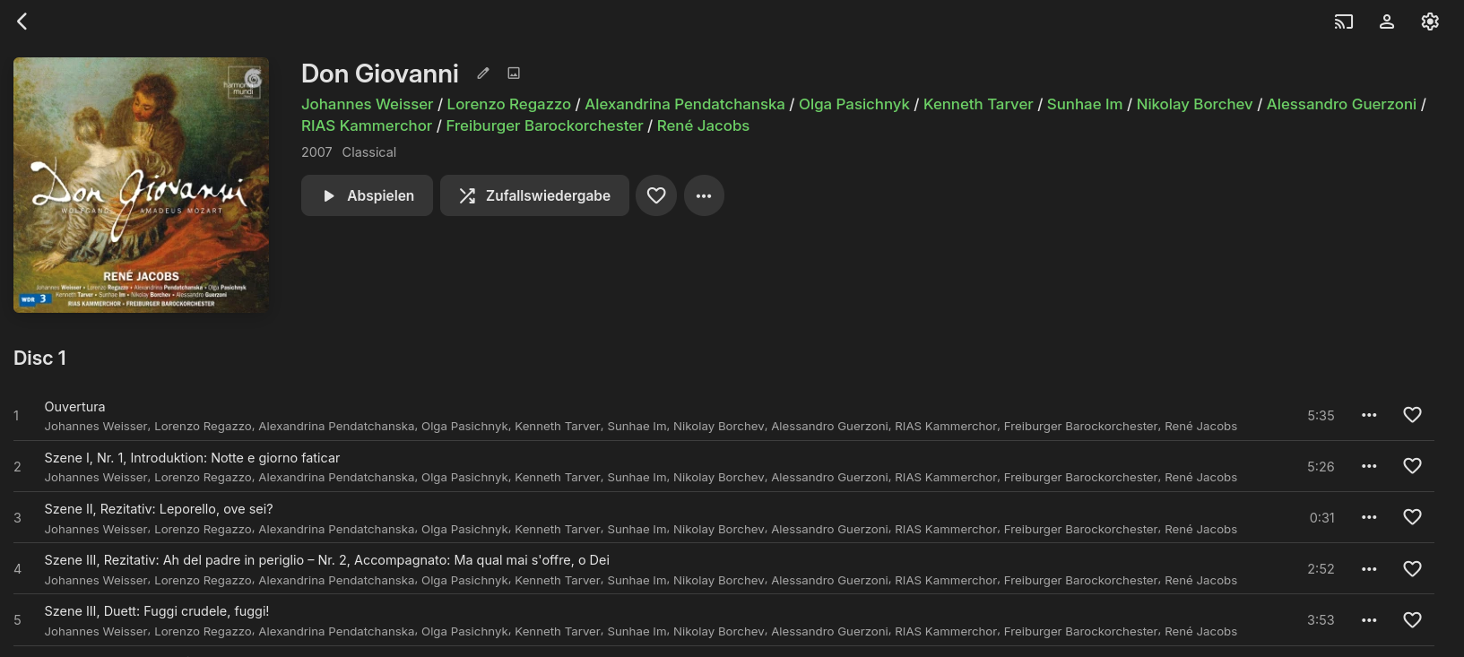 goblin2k3 6 Posted August 9, 2025 Author Posted August 9, 2025 Thank you for your reply. 2 hours ago, user24 said: Have you looked at: Edit Metadata > People > Name + Type (Composer) for adding Composers to Music Videos? I don't know how well this may or may not coincide with Composers in music libraries - but perhaps worth a look to see what is possible? That does not help, as "People" and "Artists" are obviously stored in different tables of the database (a kinda silly design choice if you ask me, as there are actors who are also singers, classical composers who have written movie soundtracks etc.) 2 hours ago, user24 said: f you didn't have this info in your embedded tags when importing into Emby, then Emby may have 'guessed' and assigned the wrong ID? I know it's possible to correct the Musicbrainz ID in the artist metadata, which would change it for all "connected" songs. However it would be better, if you could change it directly for a specific song, as there are as a matter of fact composers sharing the same name (Johann Strauss, for example). 2 hours ago, user24 said: This sorta makes sense, but I don't think an "albumcomposer" type of tag actually exists as any standard anywhere??? What you could do is experiment with the Album Artist tags and come up with a system that works for you. This is a multi-field in Emby so you can assign more than one Album Artist to an individual album (e.g. a performer Album Artist and a composer Album Artist), if you want to. So you are essentially making your own Album Composer assignment which should then appear under "Albums" on the Composer detail page. Assigning more than one Album Artist is a really good way of cross-referencing your music library. In my opinion, both artist fields should be reserved for performers. Also, some classical productions already come with a lot of album artists (soloists, choir, orchestra, conductor), there is really no need to expand it even more, when you can just have a different field for a completely different role: Of course "albumcomposer" is not a standard ID 3 tag, but a lot of tags used by Musicbrainz Picard (like artistsort, performer, musicbrainz_artistid) aren't either. They are added, because it makes sense adding them.