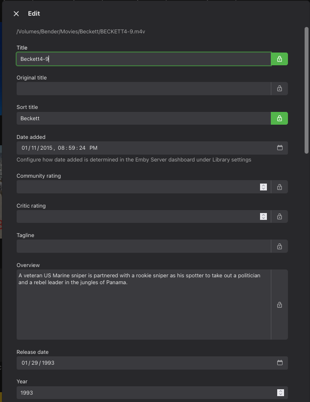 Happy2Play 9780 Posted August 17, 2025 Posted August 17, 2025 So from a Movie perspective you would have to create all metadata and images manually and LOCK the metadata as it is not listed as a Movie and will always fail being queried or misidentified. But have no idea how /Beckett/Beckett4-9.mv4 could return Sniper though.