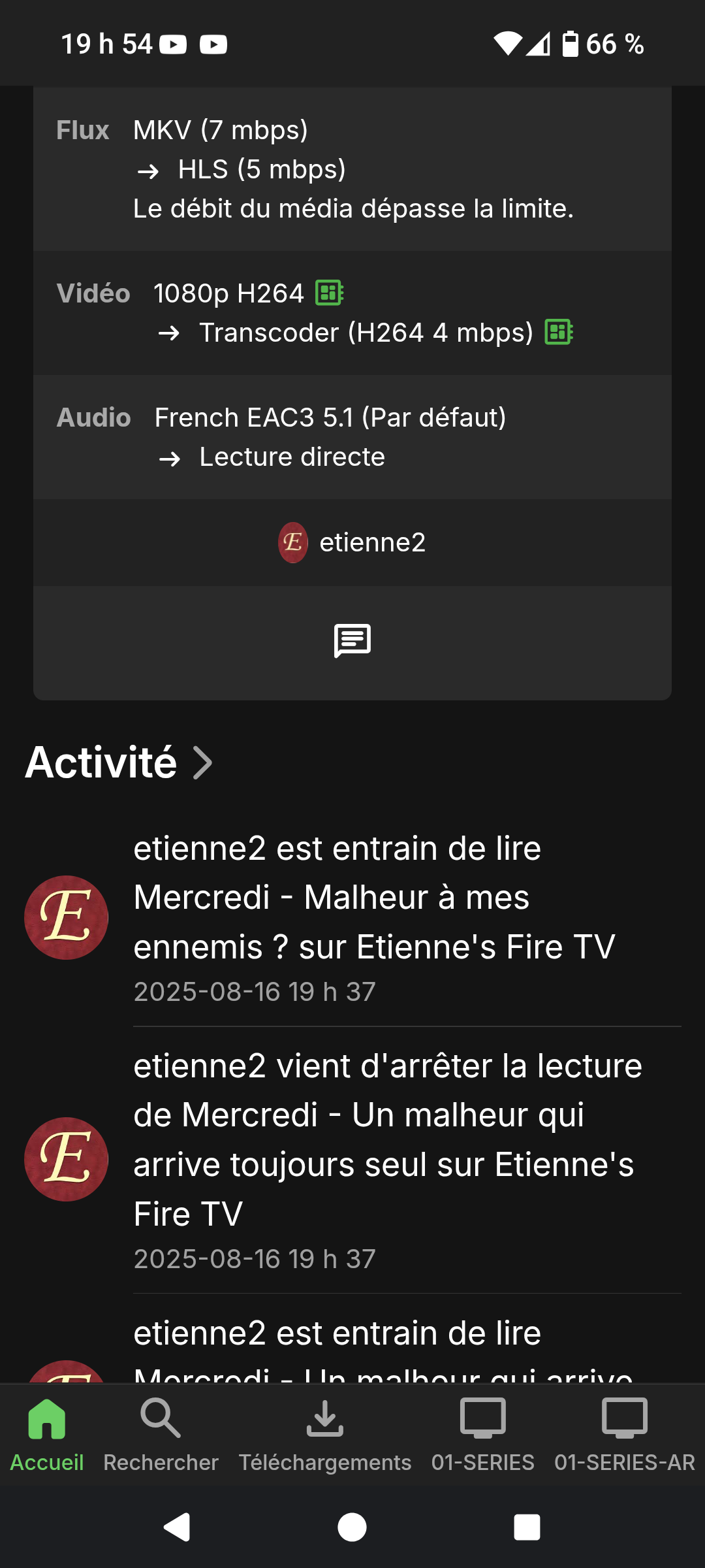 treeger8686 2 Posted August 16, 2025 Posted August 16, 2025 (edited) Hi the bug is come.back on fire tv. I have 4k file limited to 5mbits in transcoding and that use in 16 to 30 mbits. An another exemple 1080 h264 limitea du 5 mbits transcoding at 4 mbits but use 30mbits on upload only in this server emby. That arrive few day ago and i have only 50mbis that slow my job work beacause of this bugs. Nothing people have see that an no report on redddit or emby forum. Is major problem. That do 6 month amd more all.working good 5mbits limita and 5-7mbits was use before few day ago. On tv lg no problem and sony too. My sever is on window 4.8.11 Firestick v. 2.1.26a Edited August 16, 2025 by treeger8686 orthograph and add picture