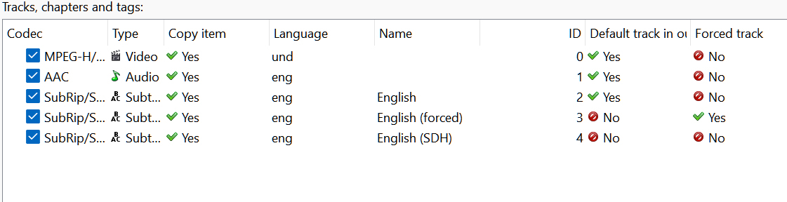 Neminem 1518 Posted August 17, 2025 Posted August 17, 2025 (edited) You should see something like this in MKVToolnix Make sure that there is only 1 set to Forces. Edited August 17, 2025 by Neminem