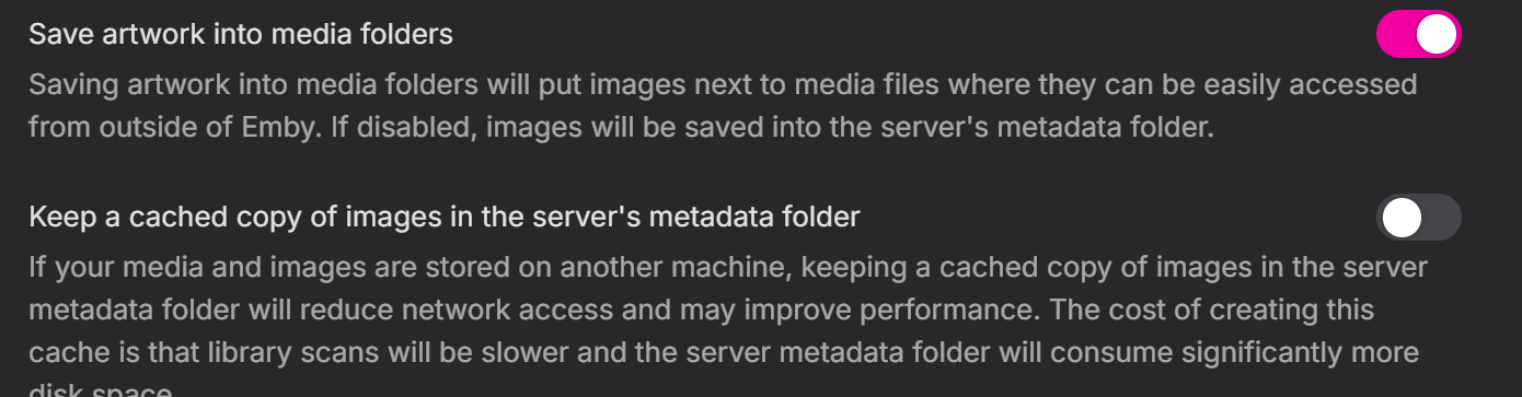 jmariani 24 Posted August 25, 2025 Posted August 25, 2025 I don't know if maybe I'm not getting it right, but I have "Keep a cached copy of images in the server's metadata folder" setting unchecked, and what I see in the log is a lot of (e.g.) "2025-08-25 15:00:56.902 Info ProviderManager: Saving image to /Users/xxx/.config/emby-server/metadata/library/95/956213f8bf567d0c467423a9faef2153/poster.jpg" Shouldn't having this setting unchecked prevent saving images to the server's metadata folder? It's taking up a lot of space in my main disk.