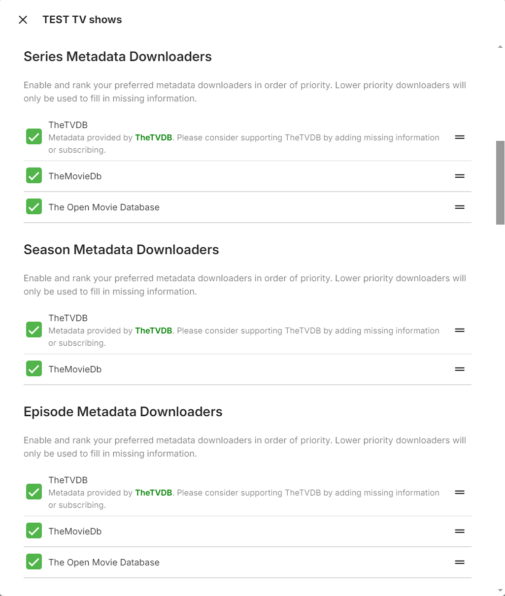 GrimReaper 4739 Posted August 26, 2025 Posted August 26, 2025 (edited) 17 minutes ago, simonmason said: So I am not sure what is going on here. Must've been a mix-up in your TV show-Season-Episode meta-downloaders sometime in the past, either priority order or providers enabled/disabled. You should start from scratch: 1) Remove Hard Knocks folder from your TV shows root 2) Run Scan media library task to clear the db 3) Confirm TVDB is top-preferred meta-downloader for Series/Season/Episode 4) Delete existing NFOs from Hard Knocks series folder (if any) 4) Move Hard Knocks series folder back 5) Scan media library If again it doesn't download correct metadata, post server log afterwards. Edited August 26, 2025 by GrimReaper