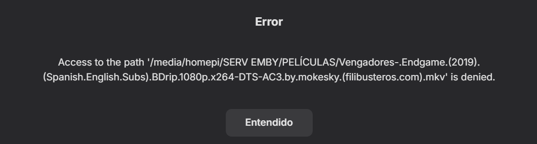 NAA67 12 Posted August 31, 2025 Author Posted August 31, 2025 11 hours ago, Luke said: HI there, can you please provide a specific example? How to Report a Problem Thanks ! Claro. Te adjunto la captura de pantalla y un archivo de registro que me ha creado al intentar eliminar un par de archivos. No sé si necesitas algo más de información. Sé que es un problema de los permisos de Emby en mi Raspberry Pi, pero puede ver y leer los archivos sin problema, pero no eliminarlos, y en los permisos de la carpeta en la Raspberry Pi está puesto "Cualquiera" en todos los campos. --- Sure. I'm attaching the screenshot and a log file it created when I tried to delete a couple of files. I don't know if you need any more information. I know it's an issue with Emby's permissions on my Raspberry Pi, but I can view and read the files without a problem, but not delete them. The folder permissions on the Raspberry Pi are set to "Anyone" in every field. embyserver.txt